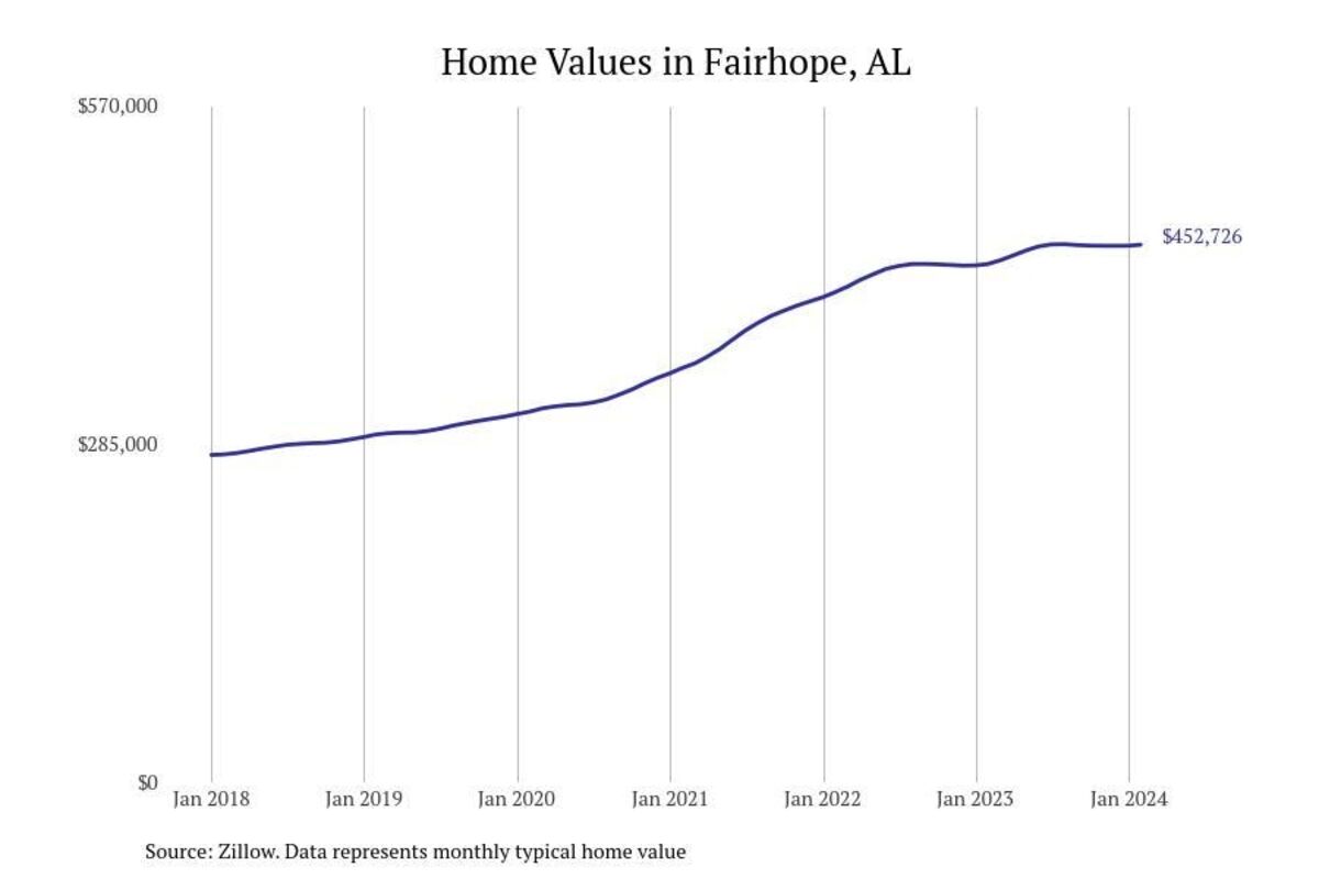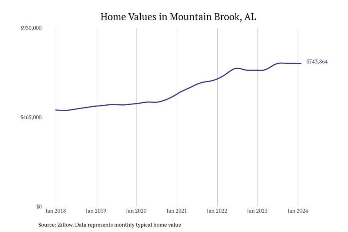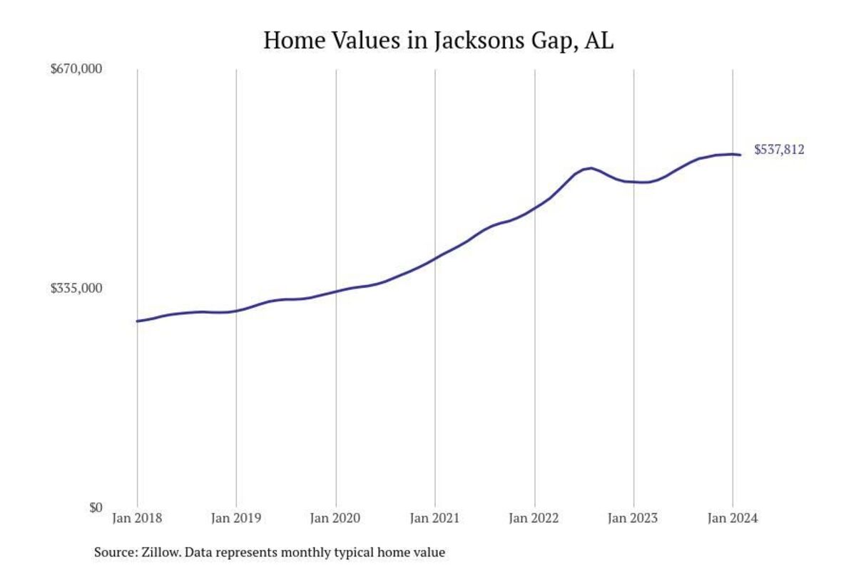 Stacker compiled a list of cities with the most expensive homes in Alabama using data from Zillow. Cities are ranked by the Zillow Home Values Index for all homes as of February 2024. The charts in this story were created automatically using Matplotlib.