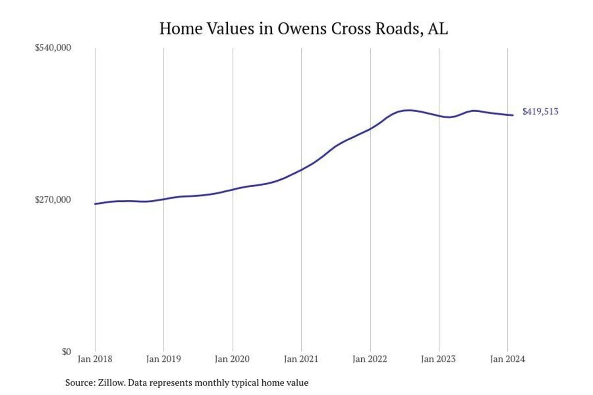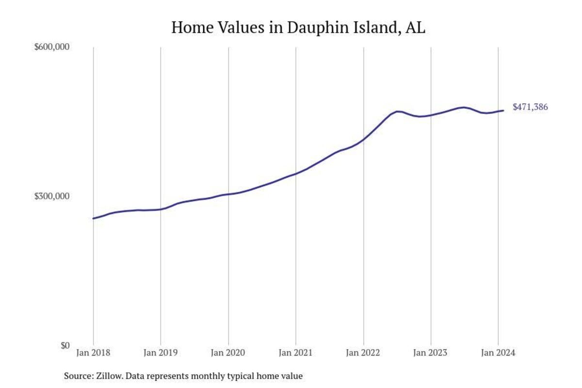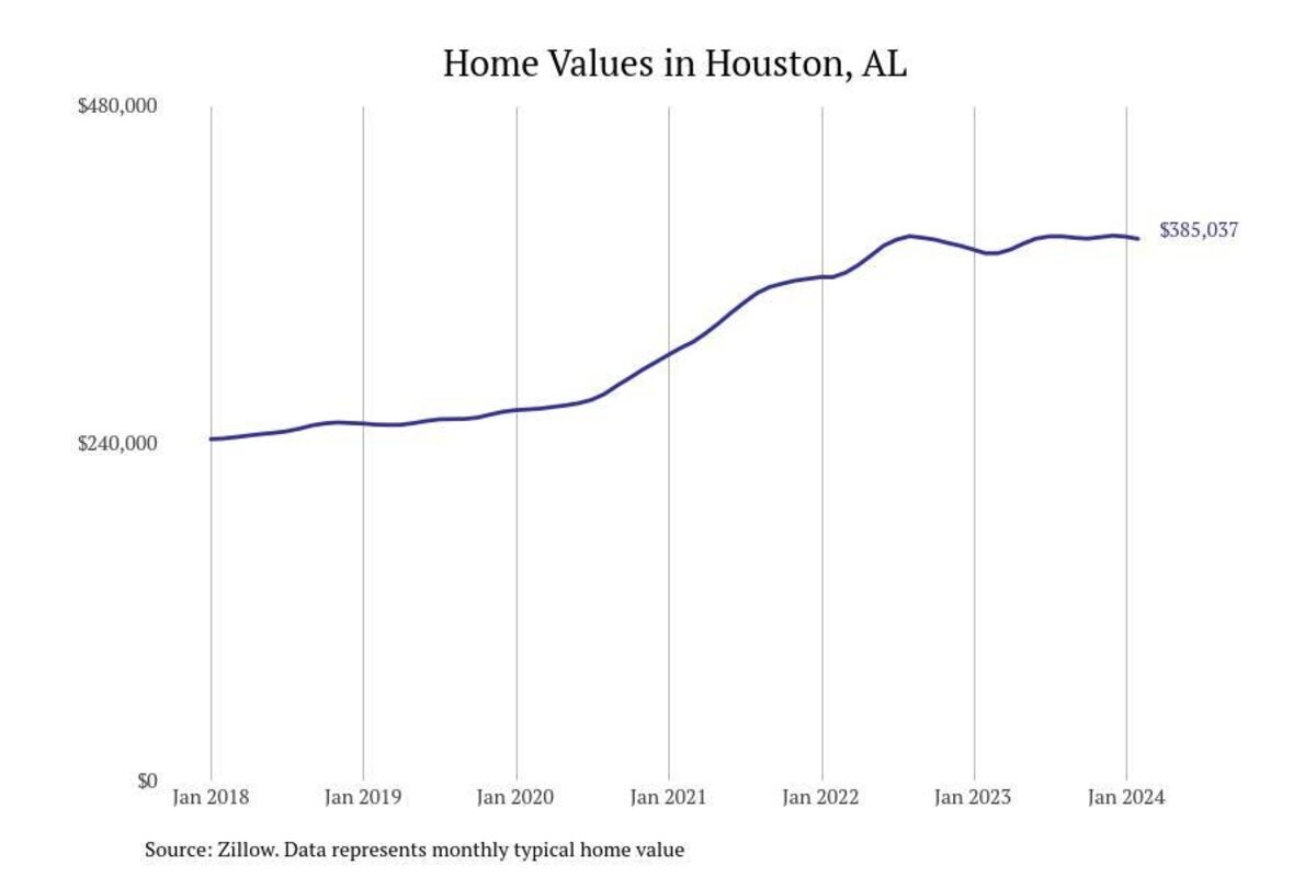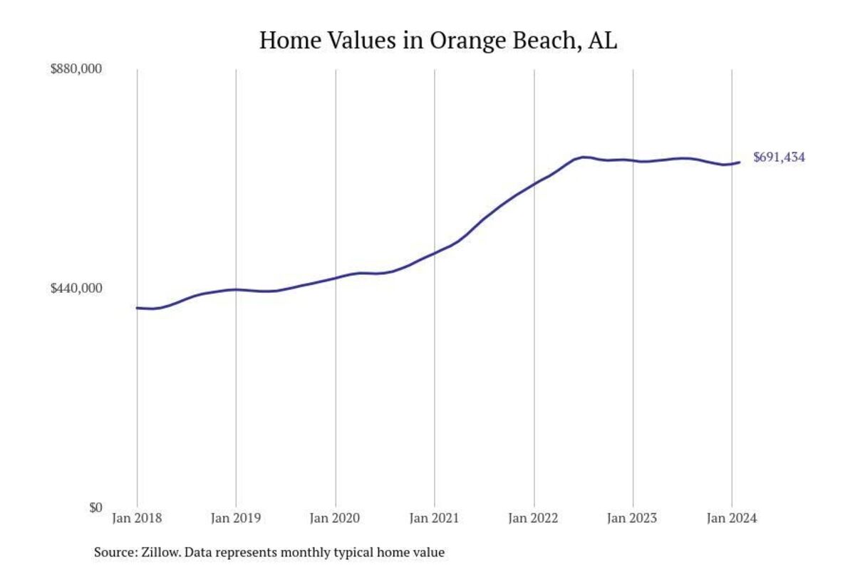 Stacker compiled a list of cities with the most expensive homes in Alabama using data from Zillow. Cities are ranked by the Zillow Home Values Index for all homes as of February 2024. The charts in this story were created automatically using Matplotlib.