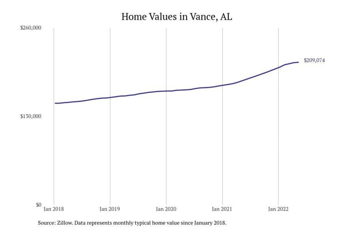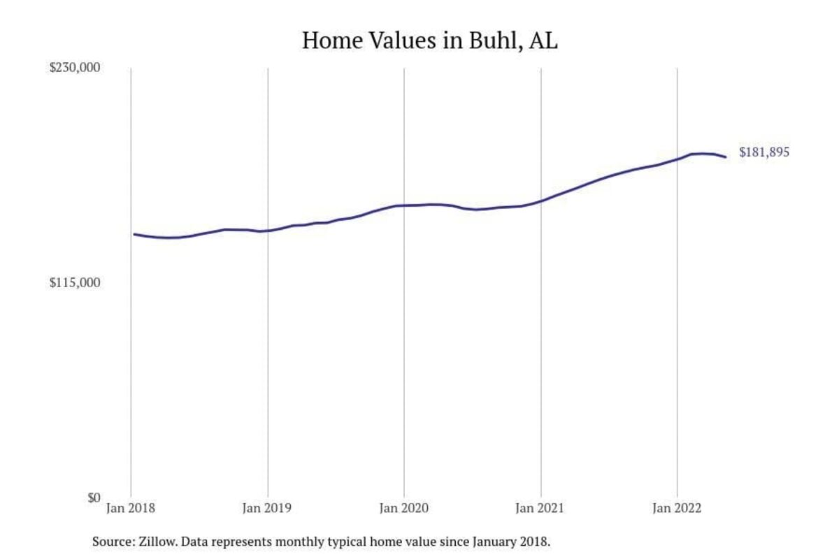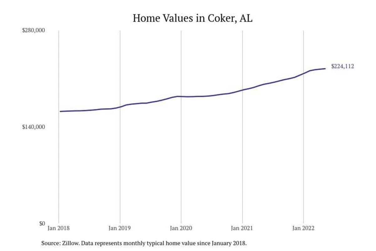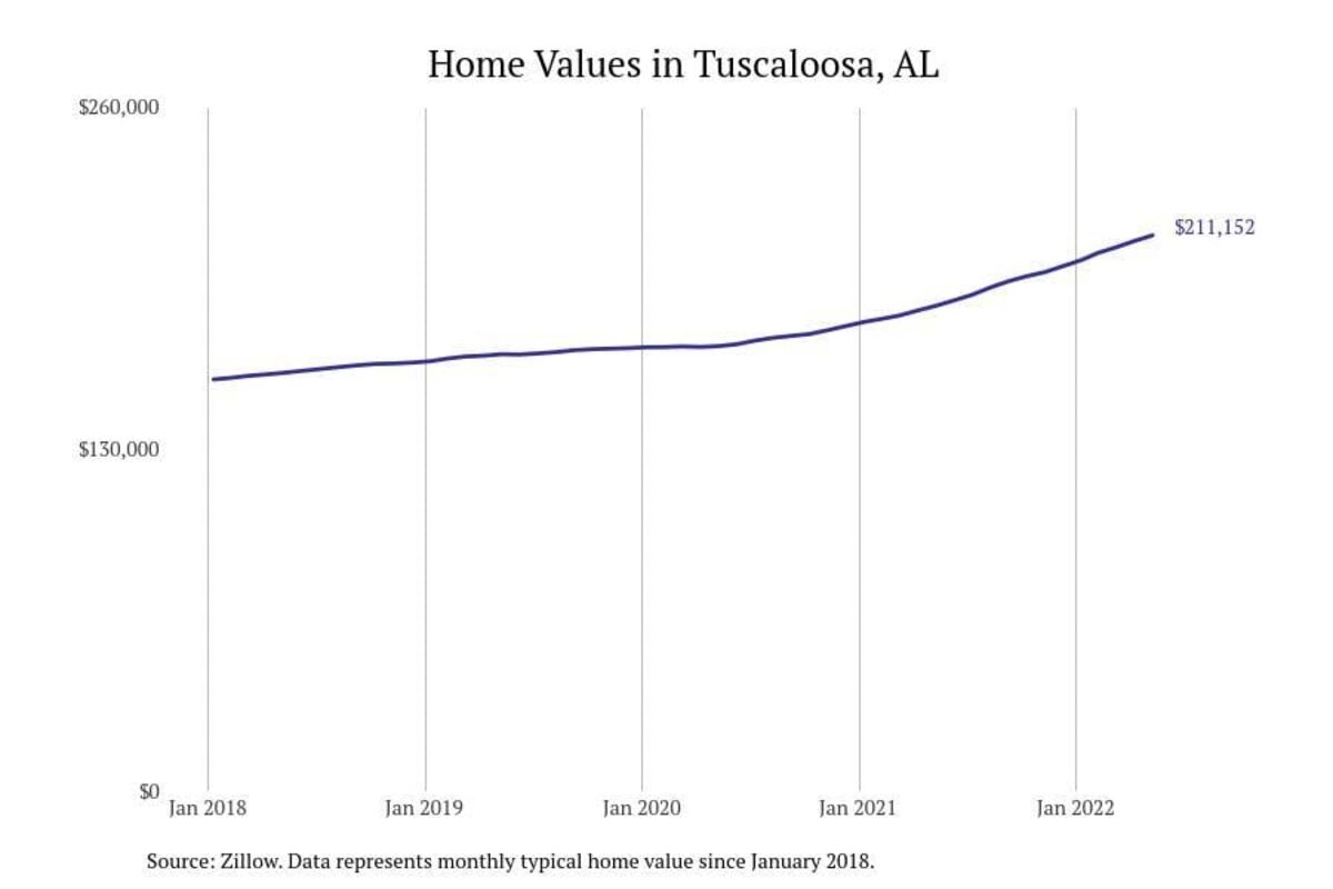 Stacker compiled a list of cities with the most expensive homes in the Tuscaloosa metro area using data from Zillow. Charts show the monthly typical home value since January 2018. All 19 cities and towns with data available were included in the list.