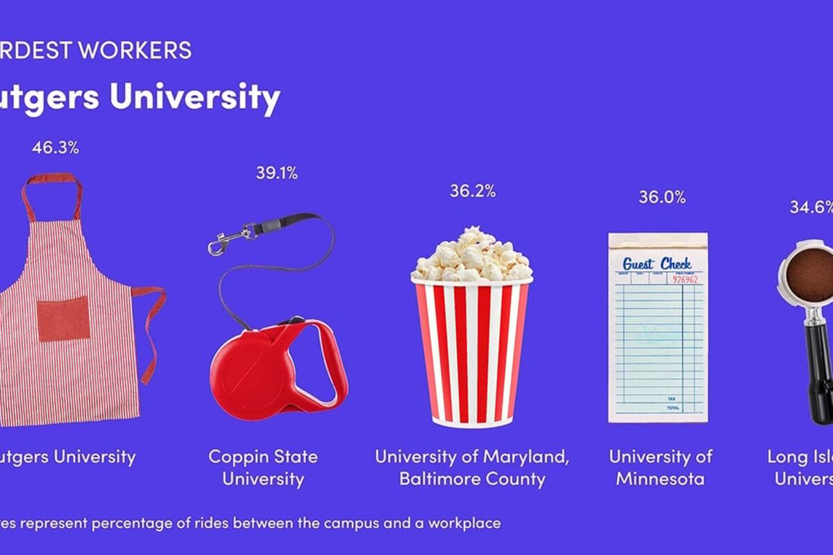 Some have to work hard to play hard, and for that, the students at Rutgers University excel. Almost half of their rides are to workplaces. Hear that, recruiters? RU Rah, Rah!