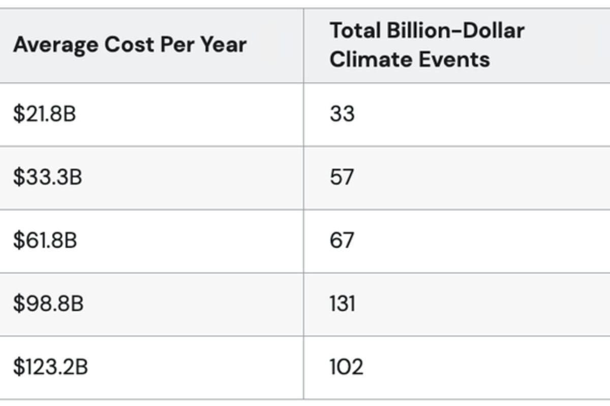 Climate events that cause $1 billion or more in damage are increasing. The U.S. saw an average of 20.4 billion-dollar weather events per year between 2019 and 2023—a 56% increase from an average of 13.1 events annually between 2010 and 2019, National Oceanic and Atmospheric Administration (NOAA) data shows.
