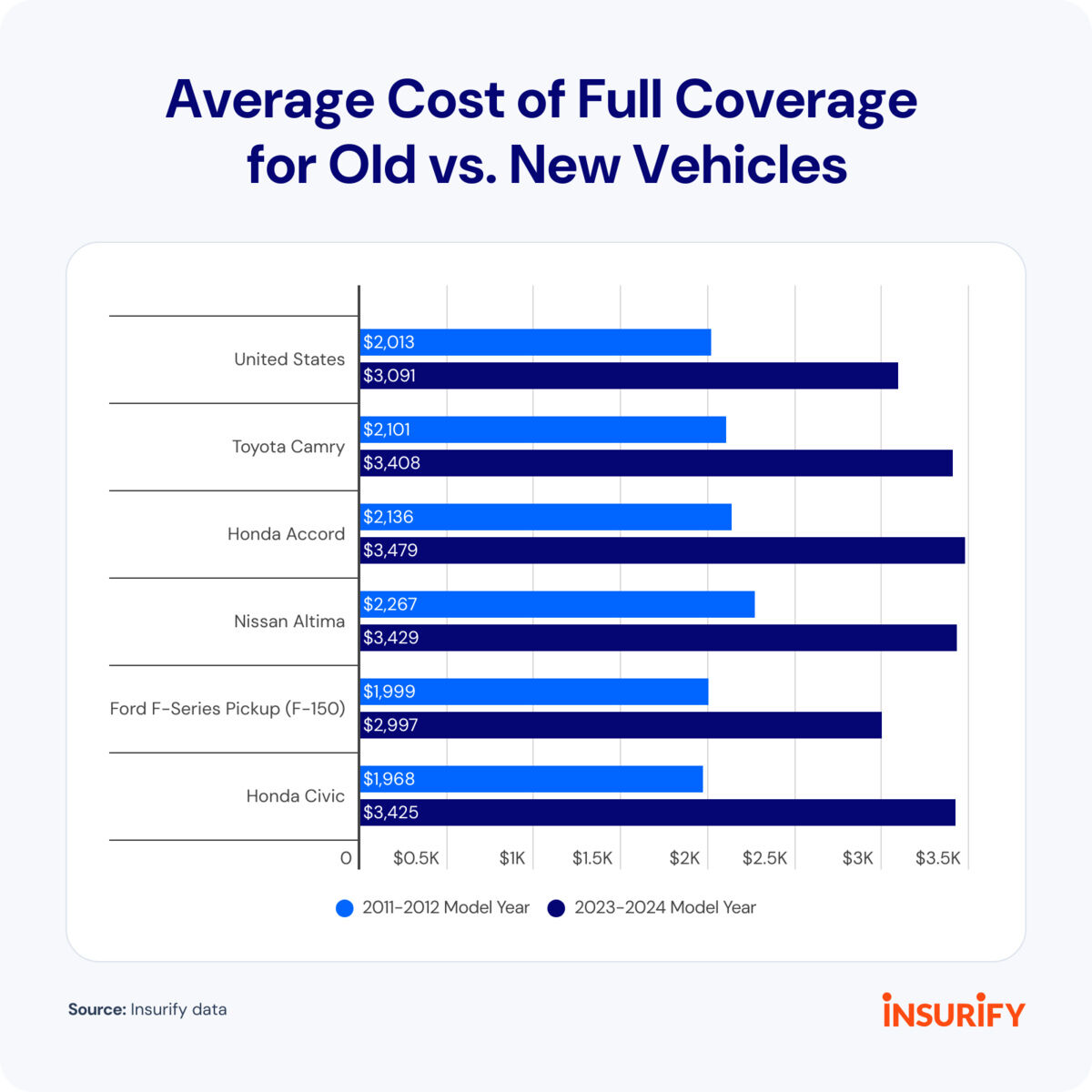 Though most insurers offer new vehicle discounts because the cars are more reliable and safer in accidents, insurance is cheaper for older vehicles. Full coverage for a 2011–2012 model year Honda Civic averages $1,968 annually, but insuring a 2023–2024 model costs 74% more, at $3,425 annually.