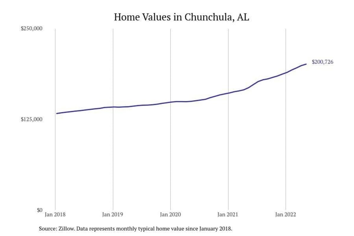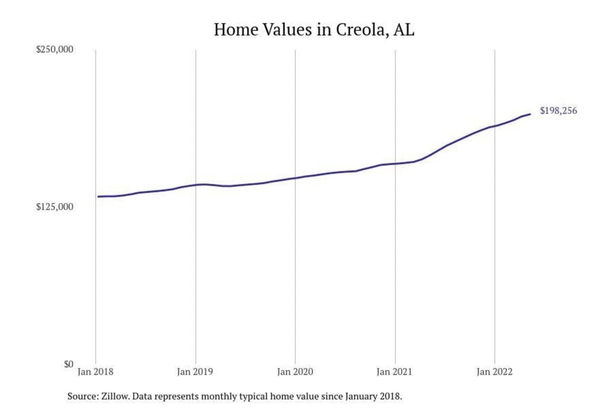 Stacker compiled a list of cities with the most expensive homes in the Mobile metro area using data from Zillow. Charts show the monthly typical home value since January 2018. All 21 cities and towns with data available were included in the list.