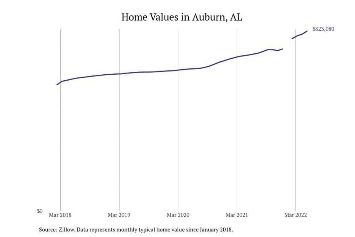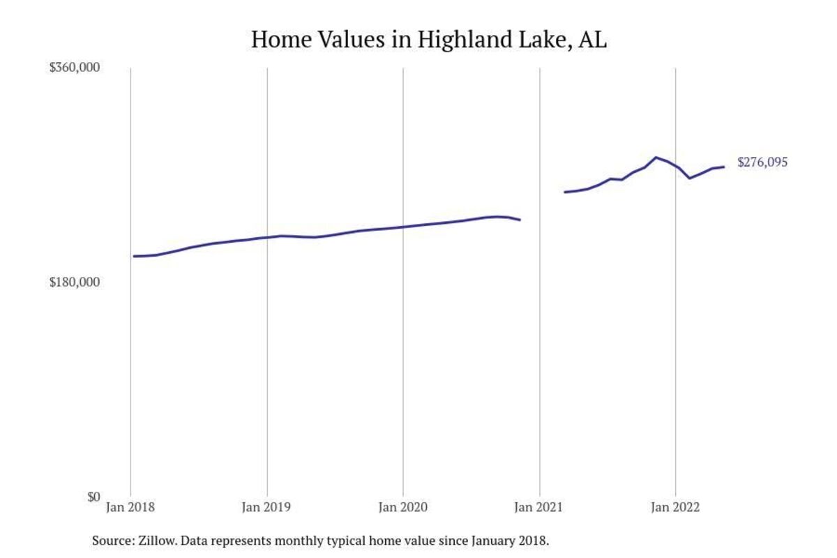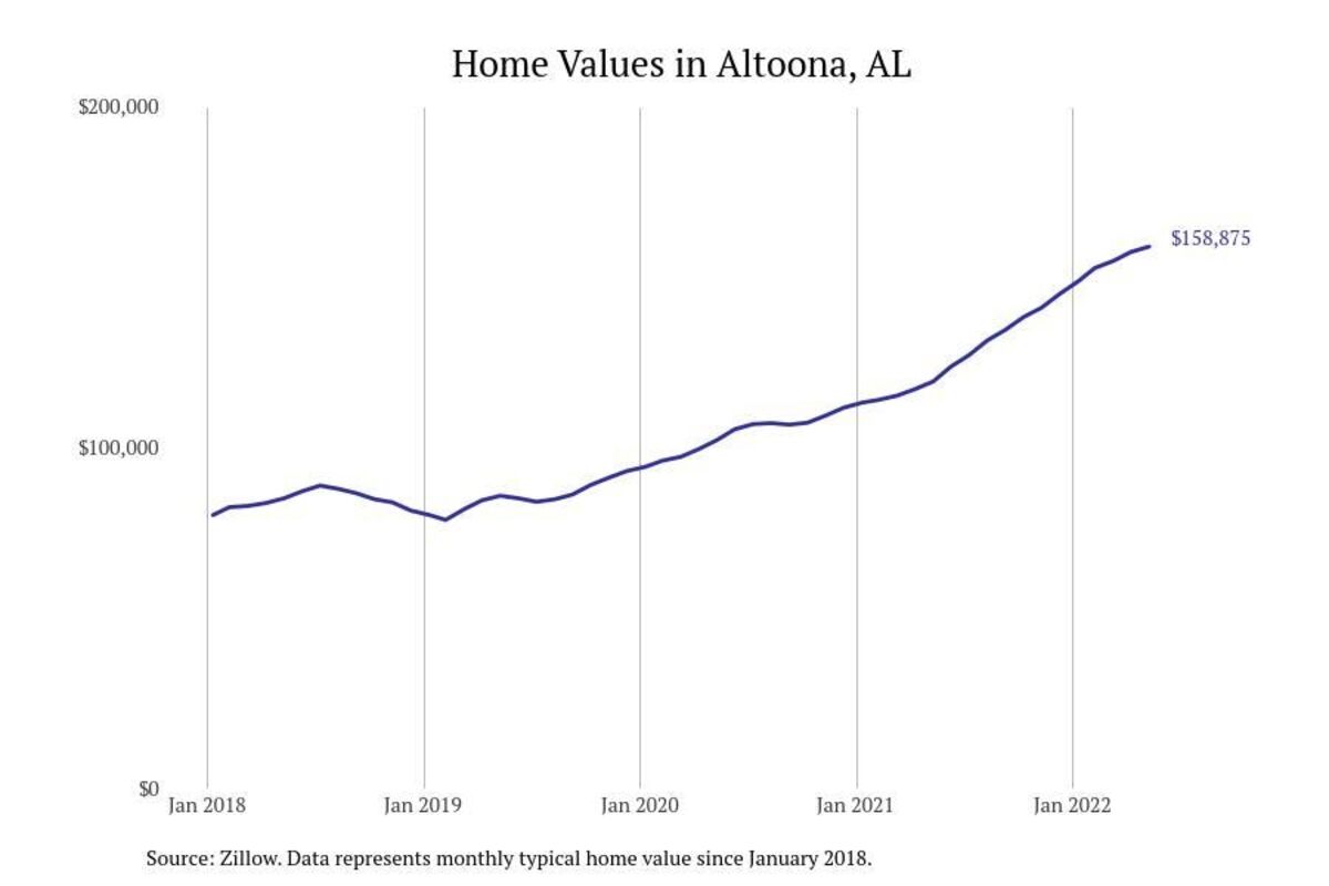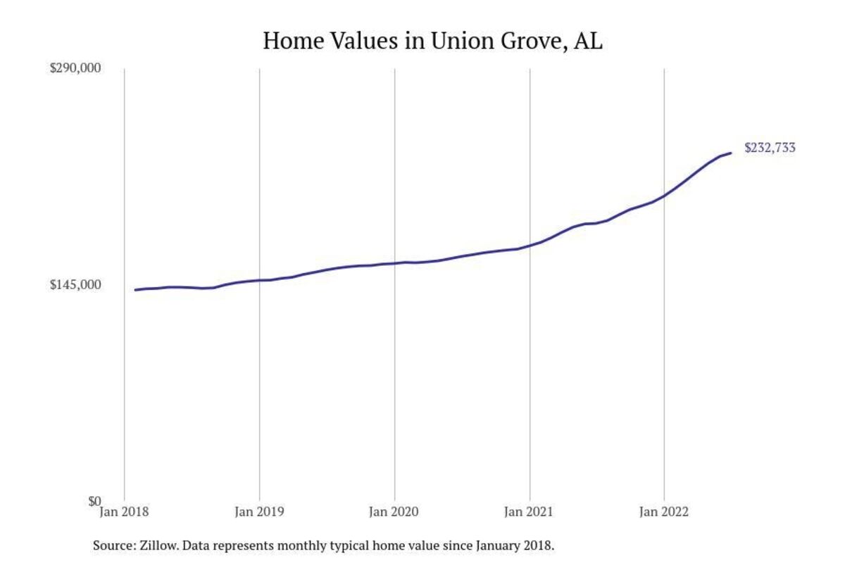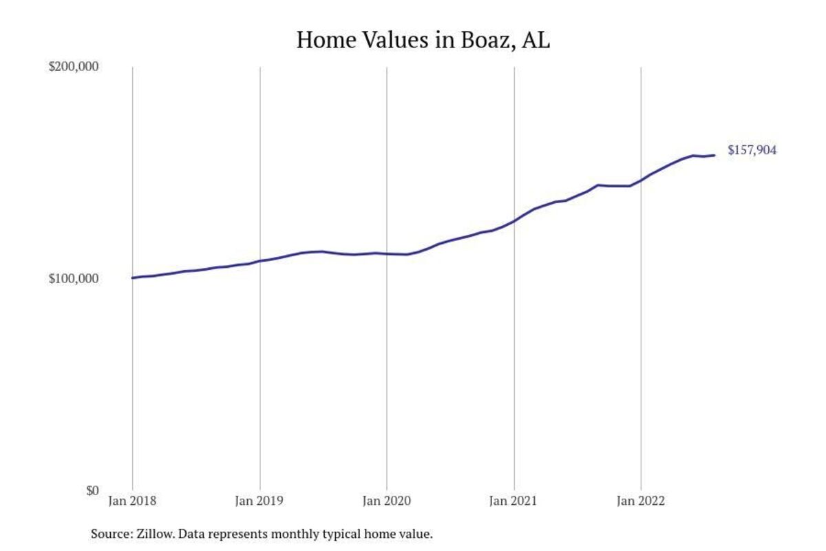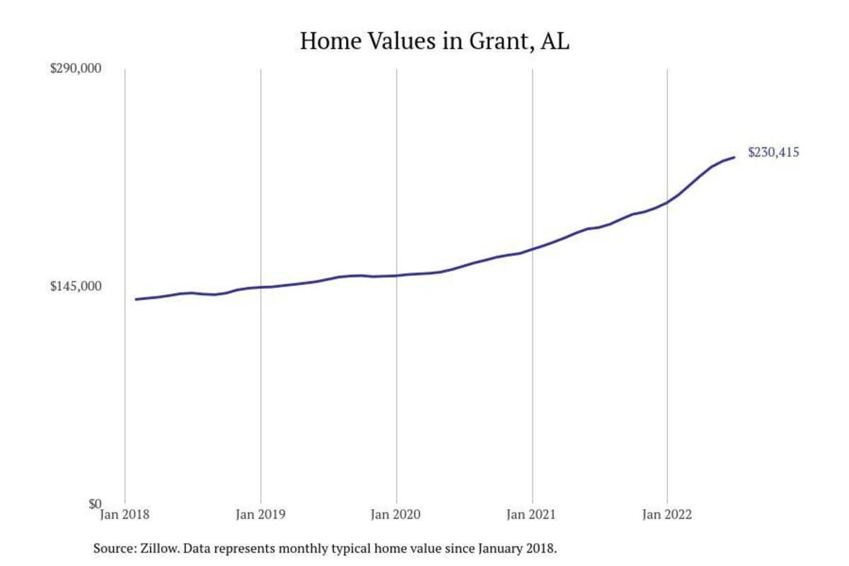 Stacker compiled a list of cities with the fastest-growing home prices in Alabama using data from Zillow. Cities are ranked by the dollar change in the Zillow Home Values Index for all homes from the 12 months ending December 2024. The charts in this story were created automatically using Matplotlib. Data was available for 50 cities and towns in Alabama.