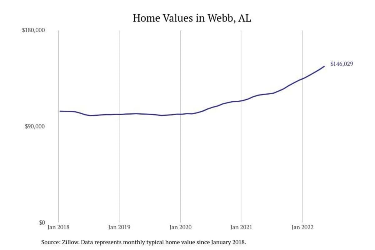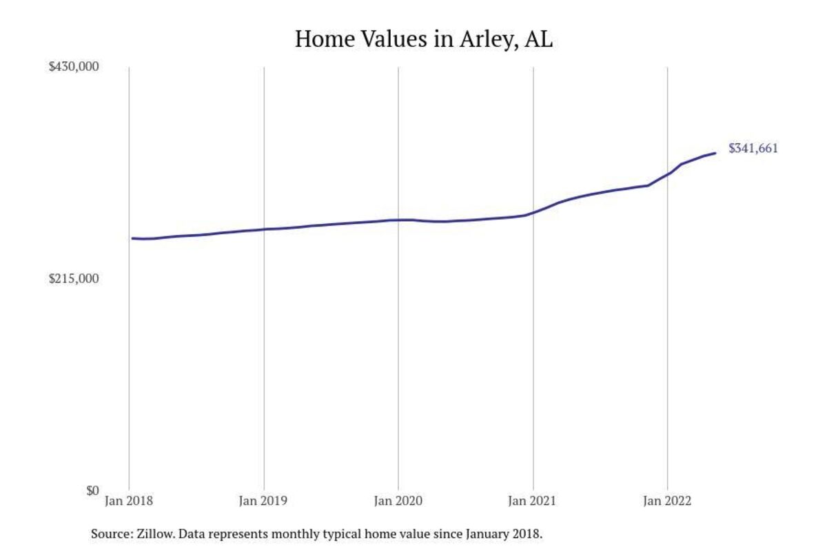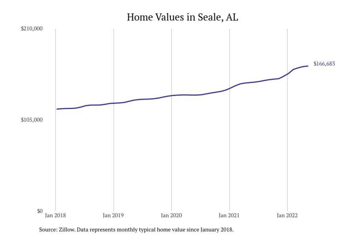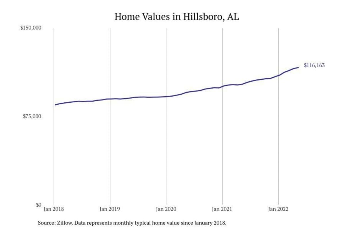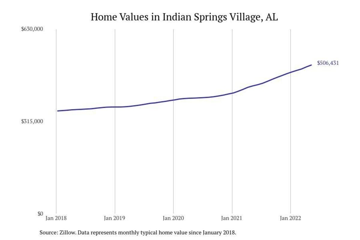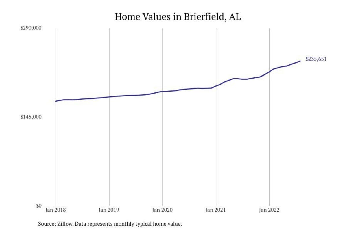 Stacker compiled a list of cities with the fastest-growing home prices in Alabama using data from Zillow. Cities are ranked by the dollar change in the Zillow Home Values Index for all homes from the 12 months ending December 2024. The charts in this story were created automatically using Matplotlib. Data was available for 50 cities and towns in Alabama.