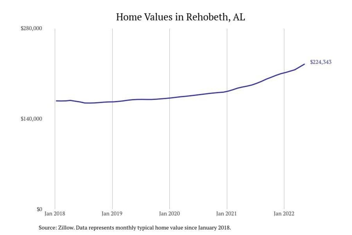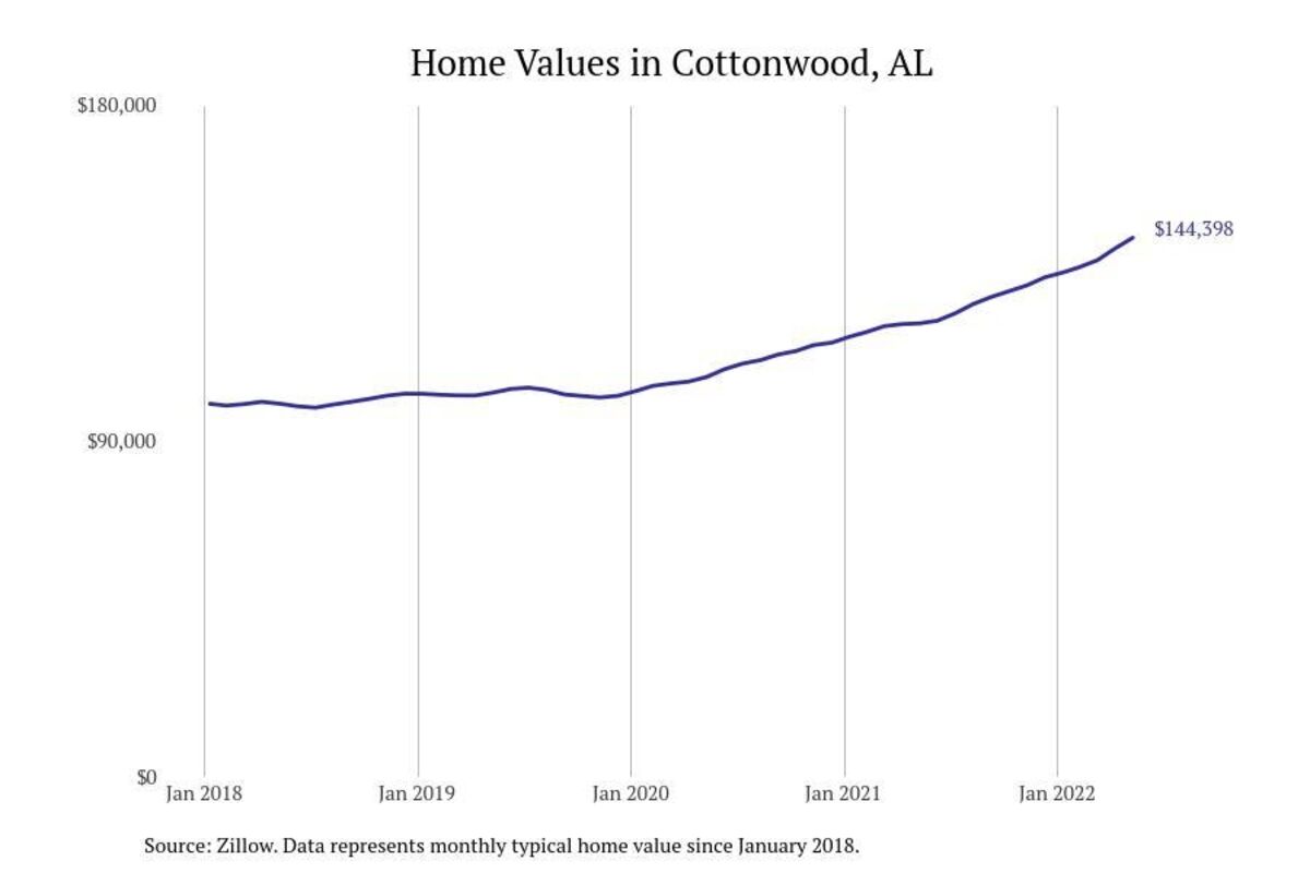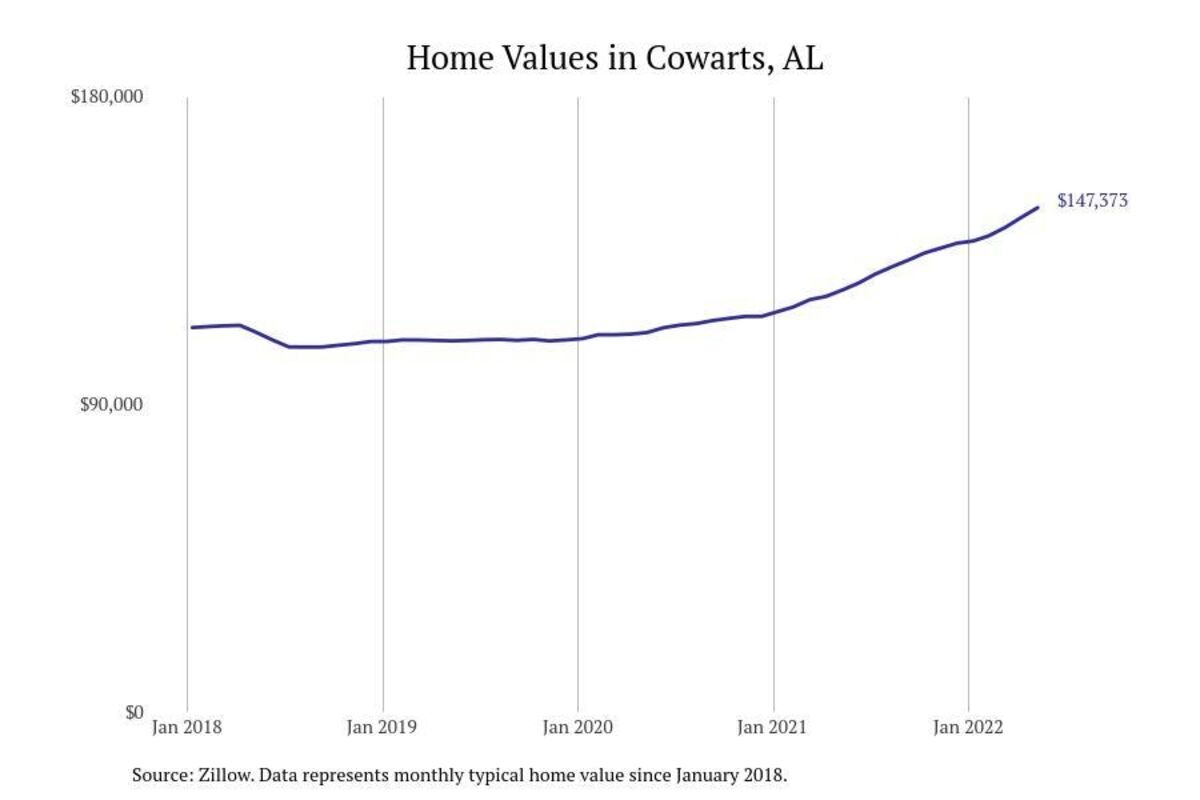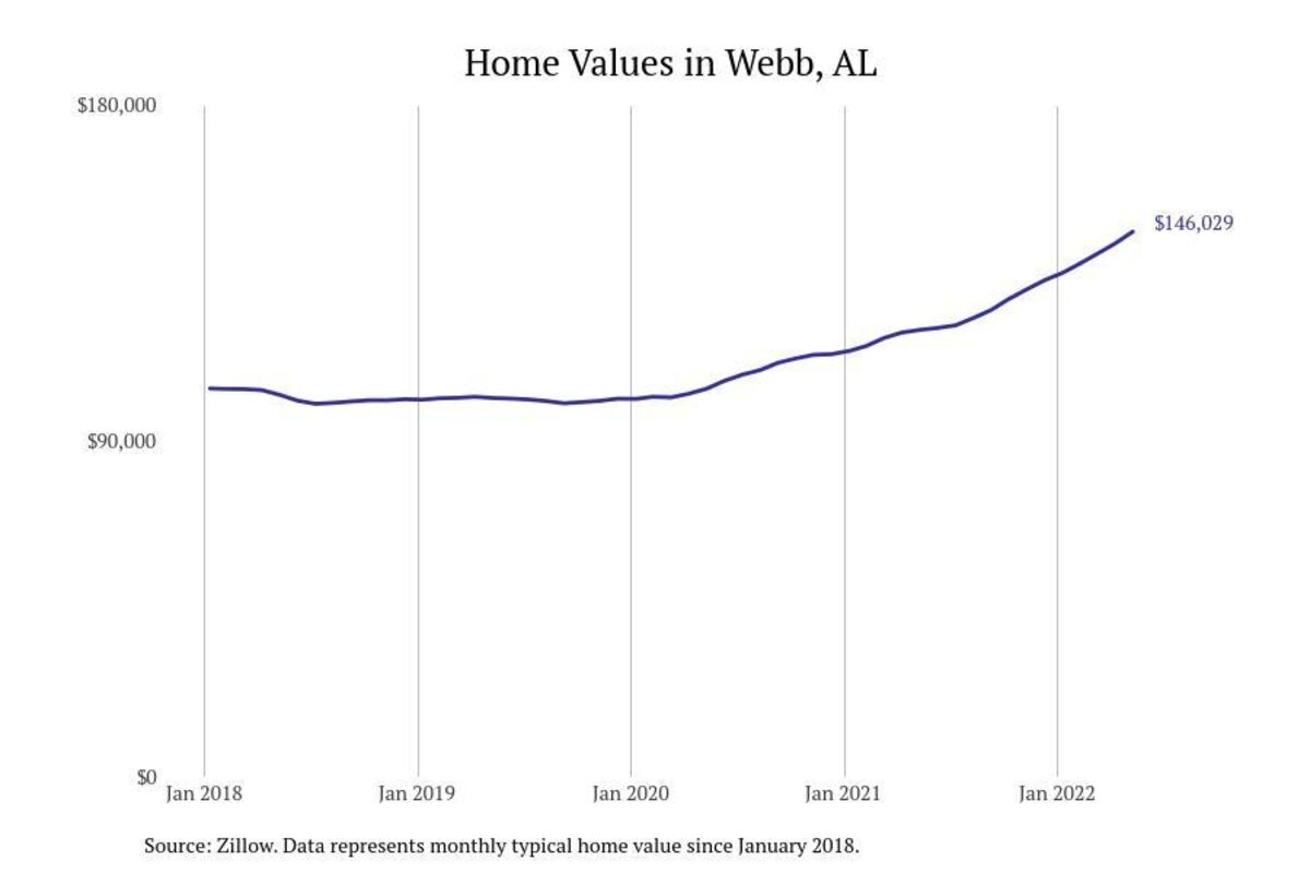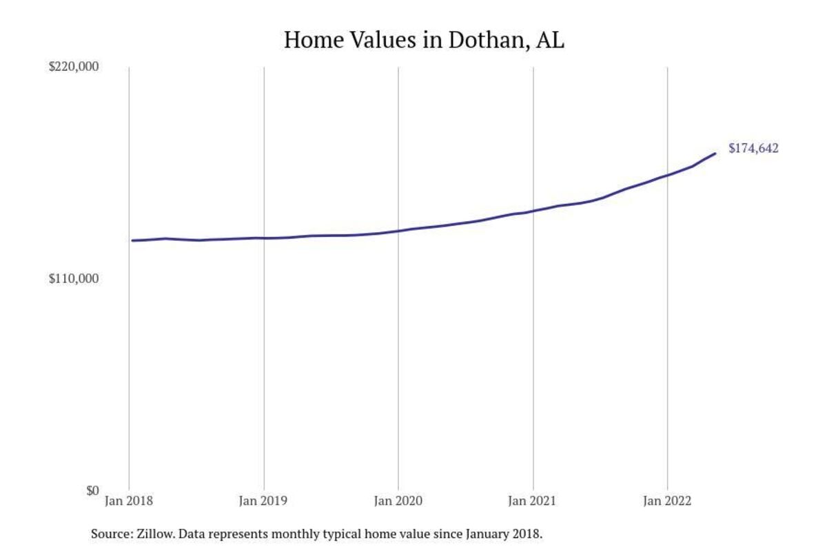 Stacker compiled a list of cities with the most expensive homes in the Dothan metro area using data from Zillow. Charts show the monthly typical home value since January 2018. All 26 cities and towns with data available were included in the list.