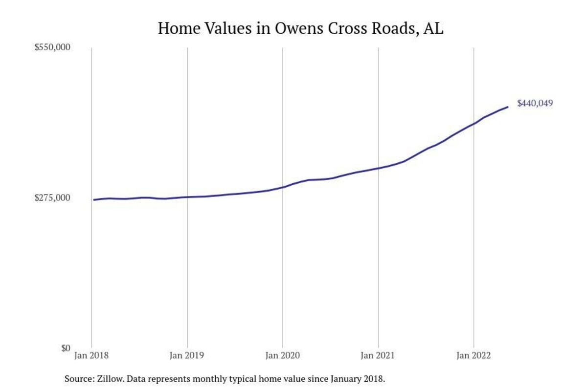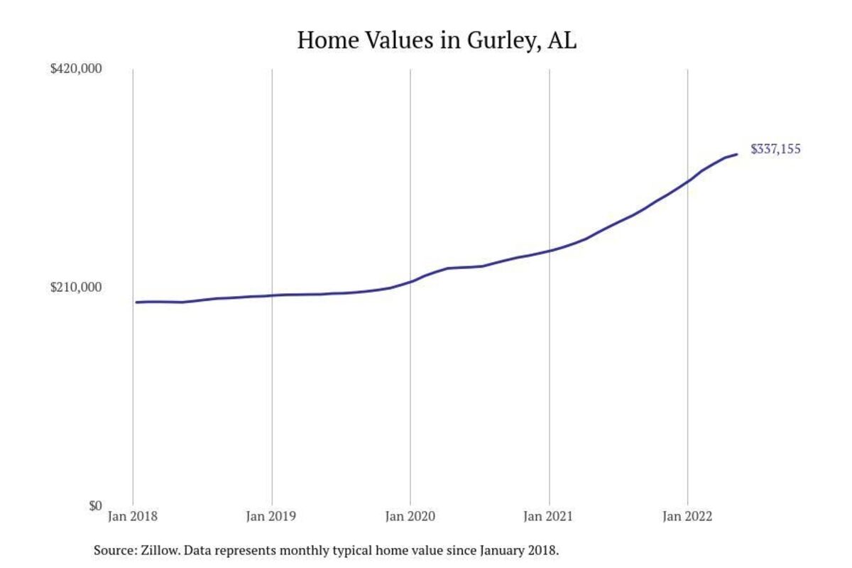 Stacker compiled a list of cities with the most expensive homes in the Huntsville metro area using data from Zillow. Charts show the monthly typical home value since January 2018. All 14 cities and towns with data available were included in the list.