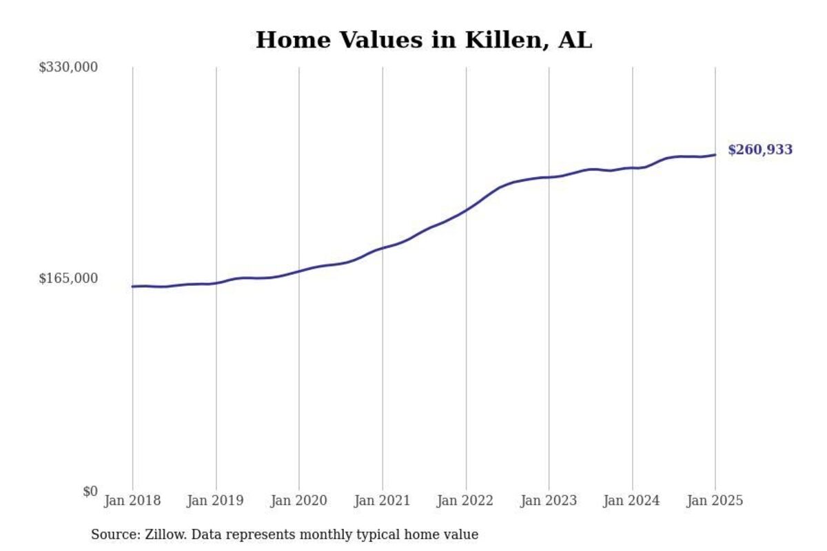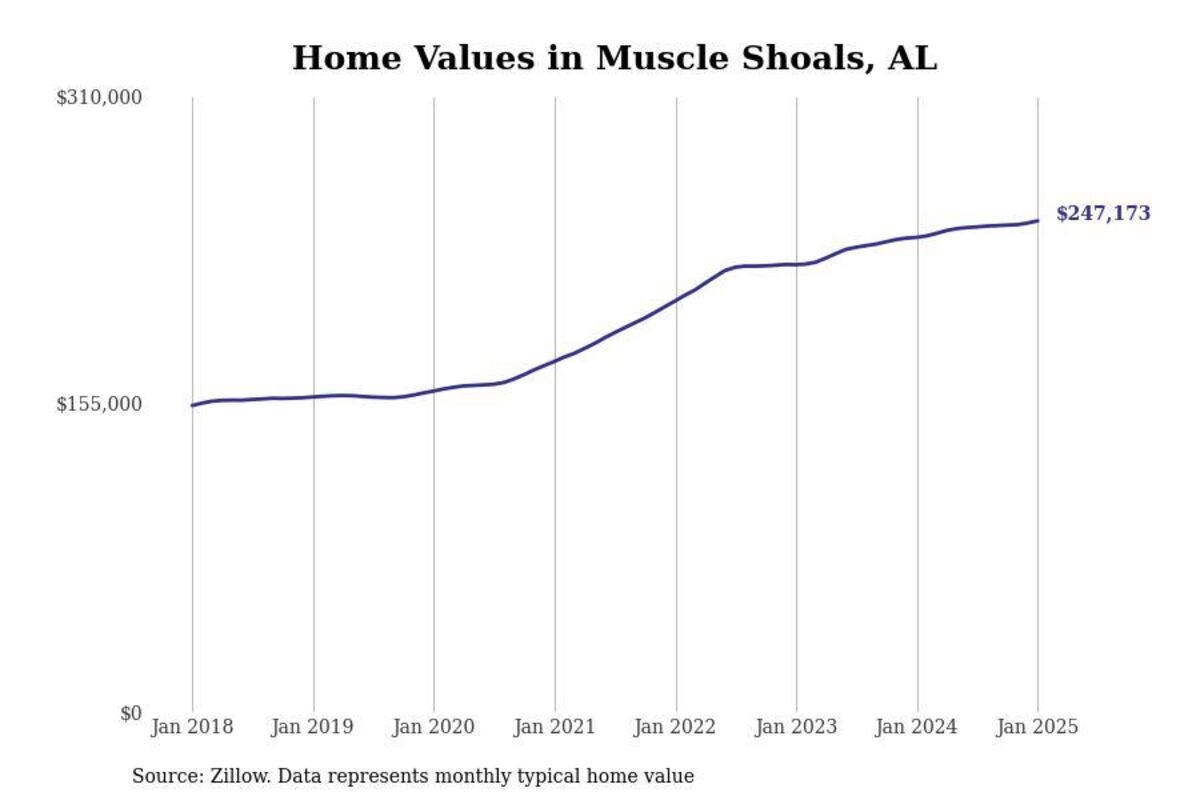 Stacker compiled a list of cities with the most expensive homes in the Florence-Muscle Shoals, AL metro area using data from Zillow. Charts show the monthly typical home value since January 2018.