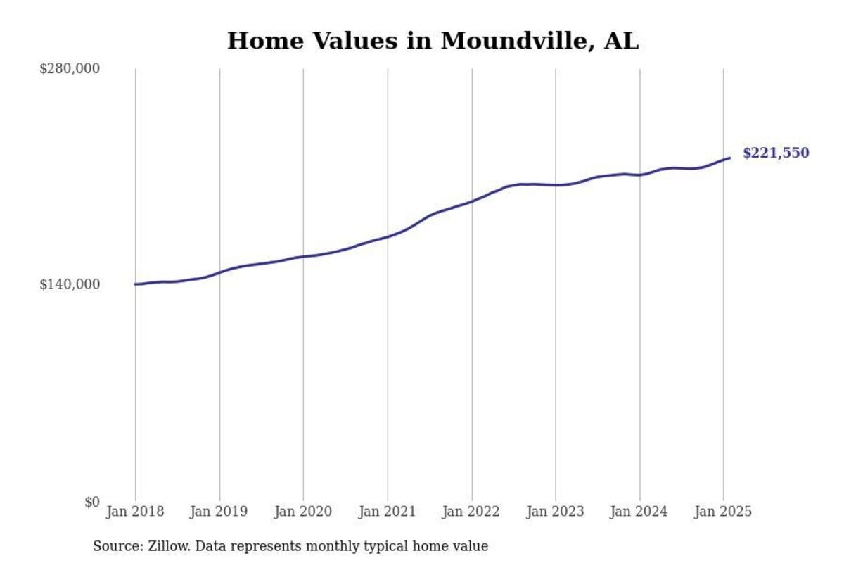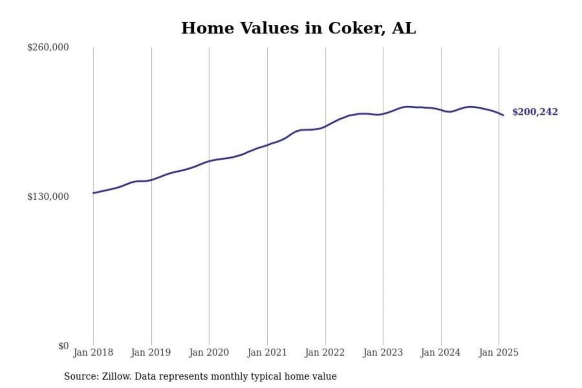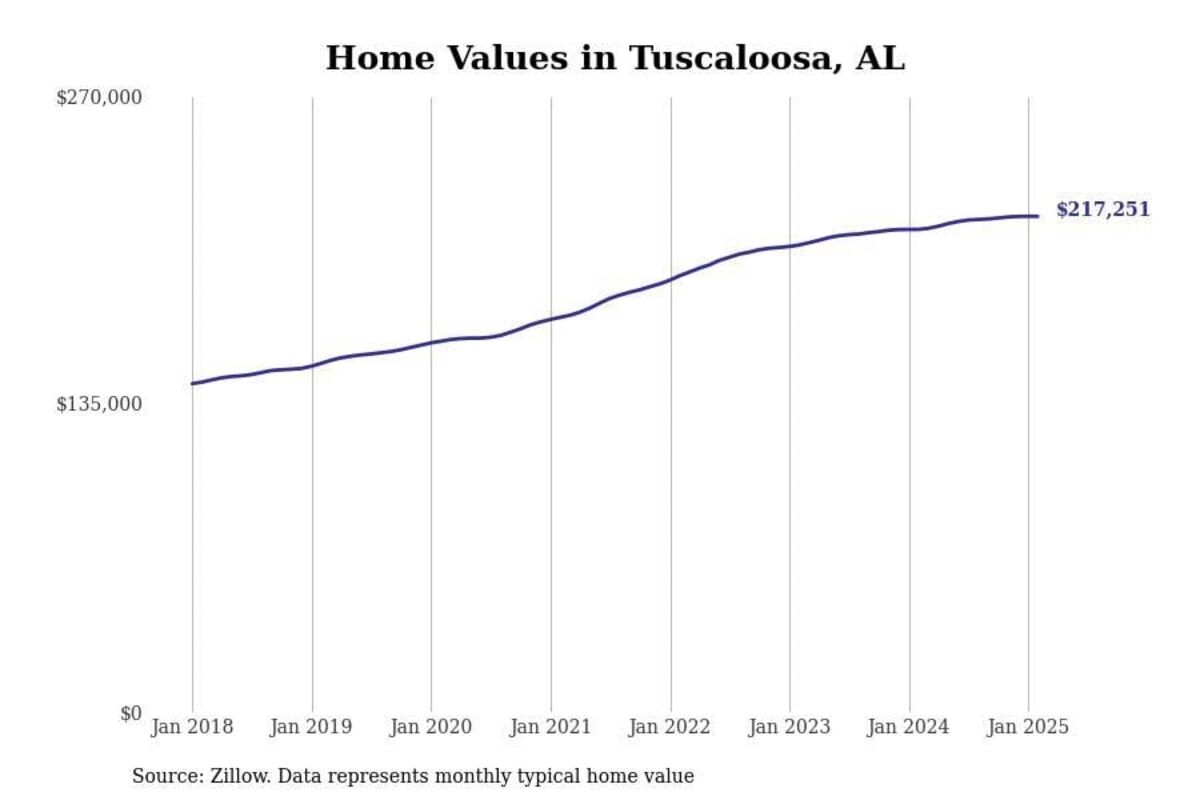 Stacker compiled a list of cities with the most expensive homes in the Tuscaloosa metro area using data from Zillow. Charts show the monthly typical home value since January 2018. All 19 cities and towns with data available were included in the list.