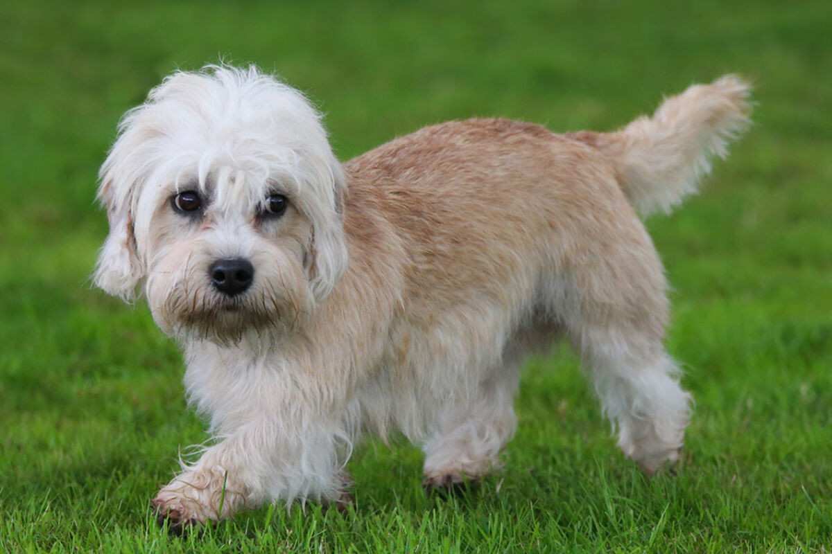 The Dandie Dinmont terrier got its name from Sir Walter Scott's 1815 novel "Guy Mannering." The diminutive dogs are known for their prominent poofs of hair atop their heads, as well as their relatively mild-mannered temperaments.