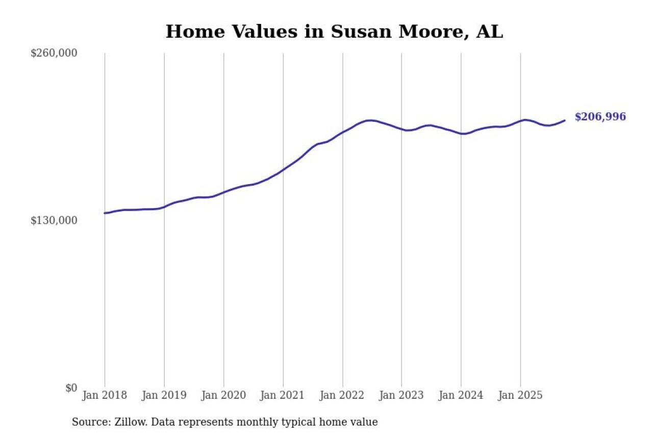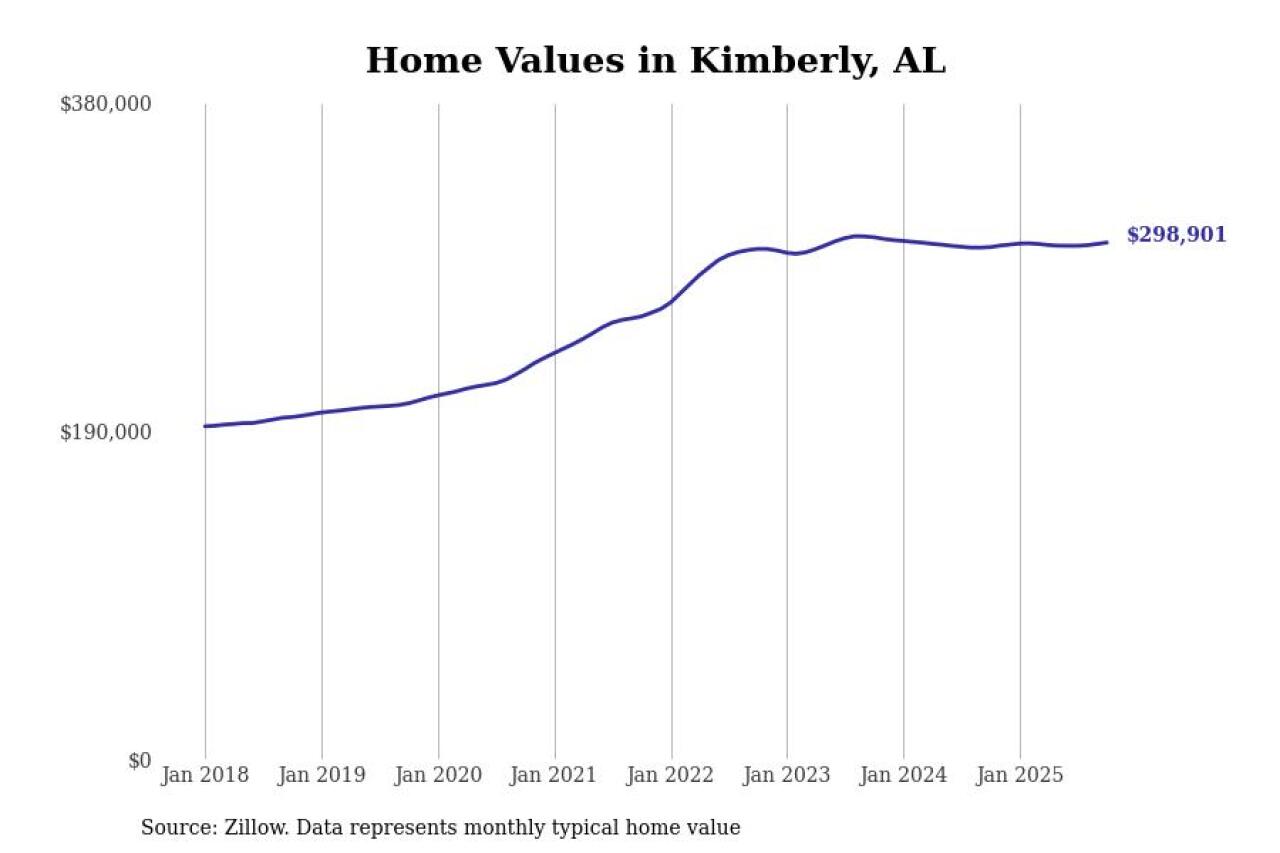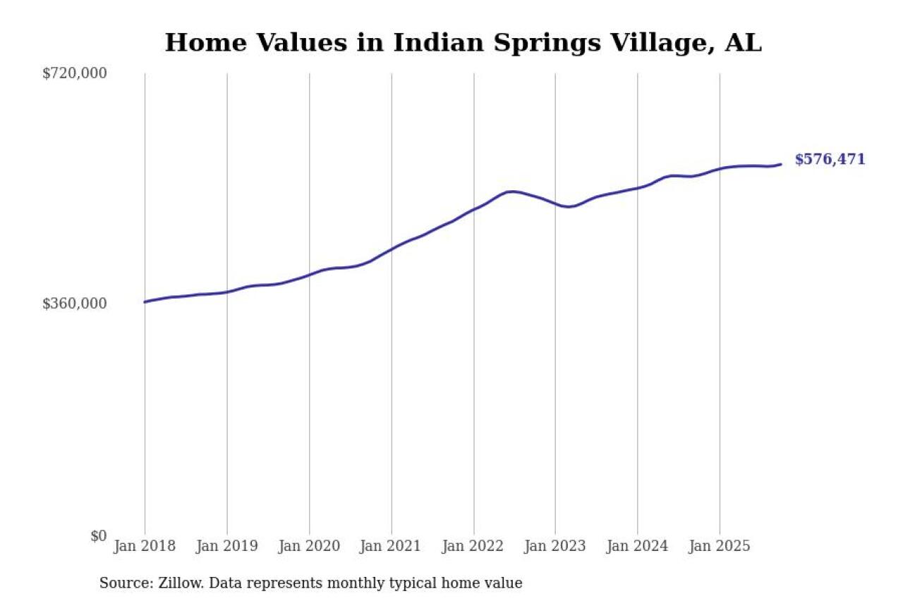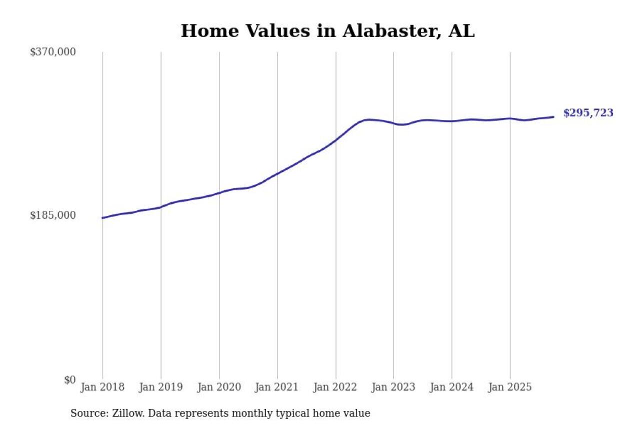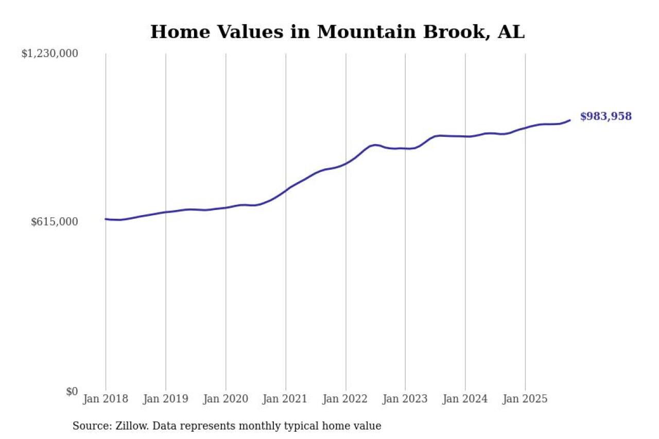 Stacker compiled a list of cities with the most expensive homes in the Birmingham-Hoover, AL metro area using data from Zillow. Charts show the monthly typical home value since January 2018.
