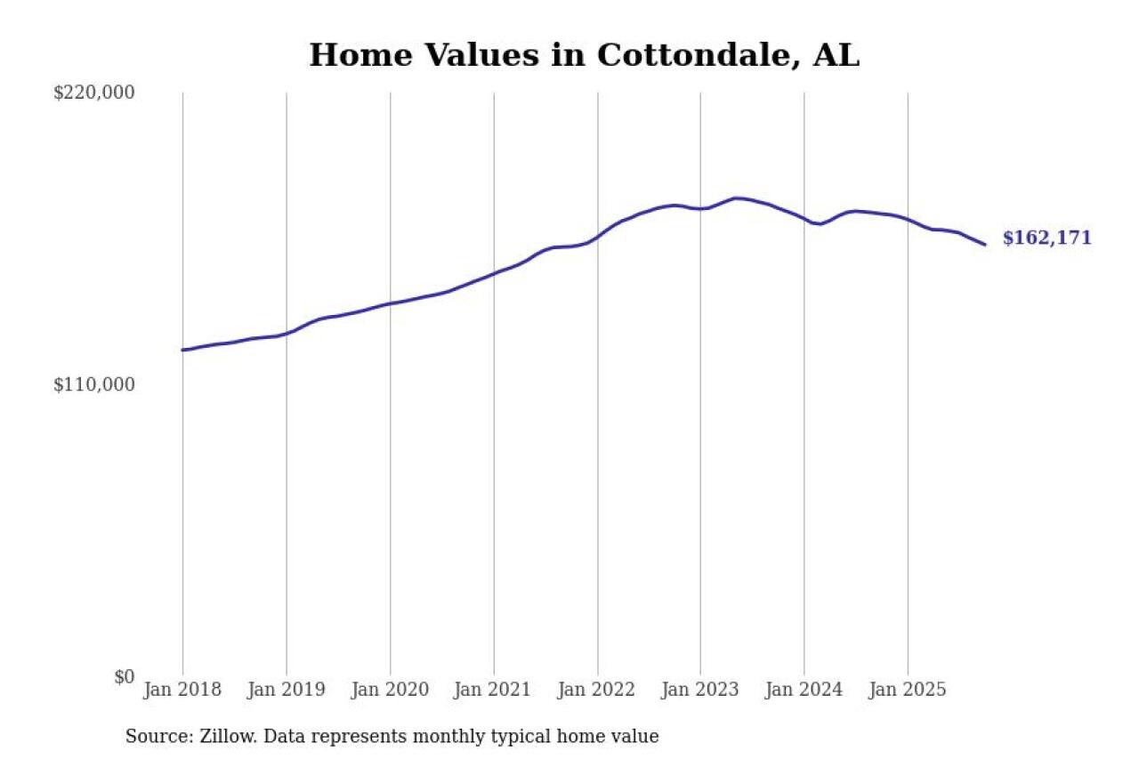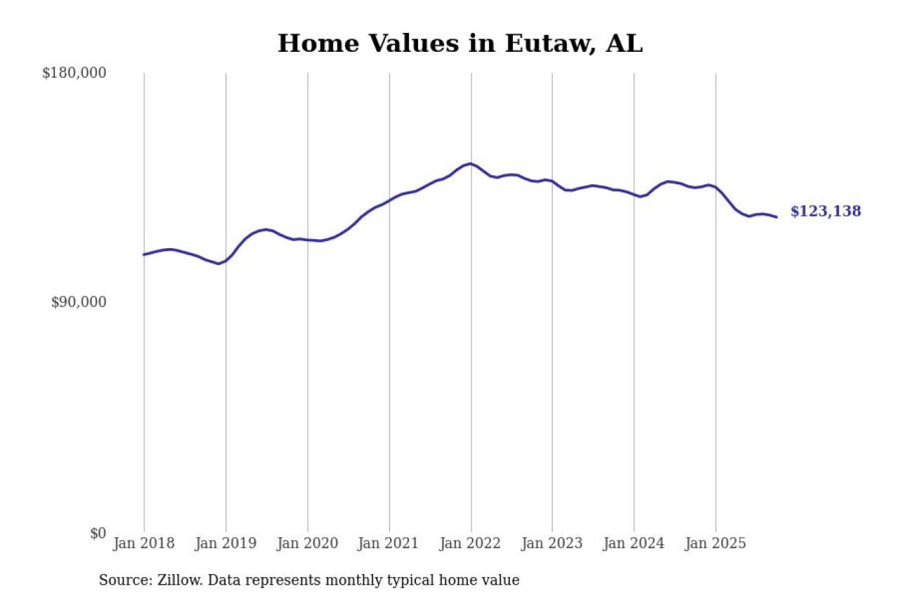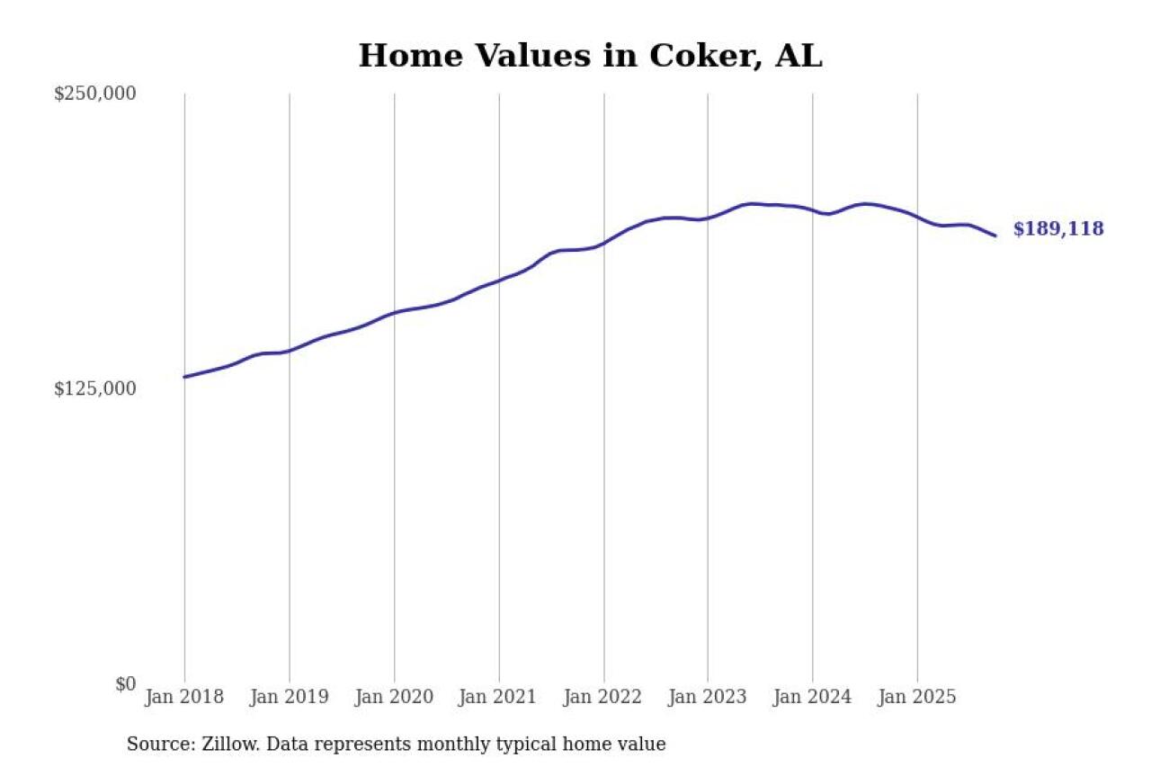 Stacker compiled a list of cities with the most expensive homes in the Tuscaloosa, AL metro area using data from Zillow. Charts show the monthly typical home value since January 2018.