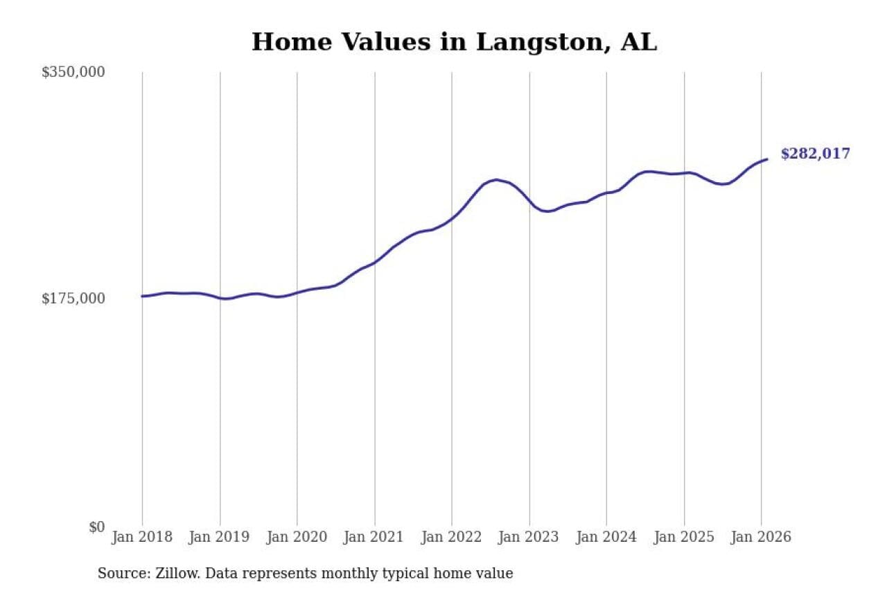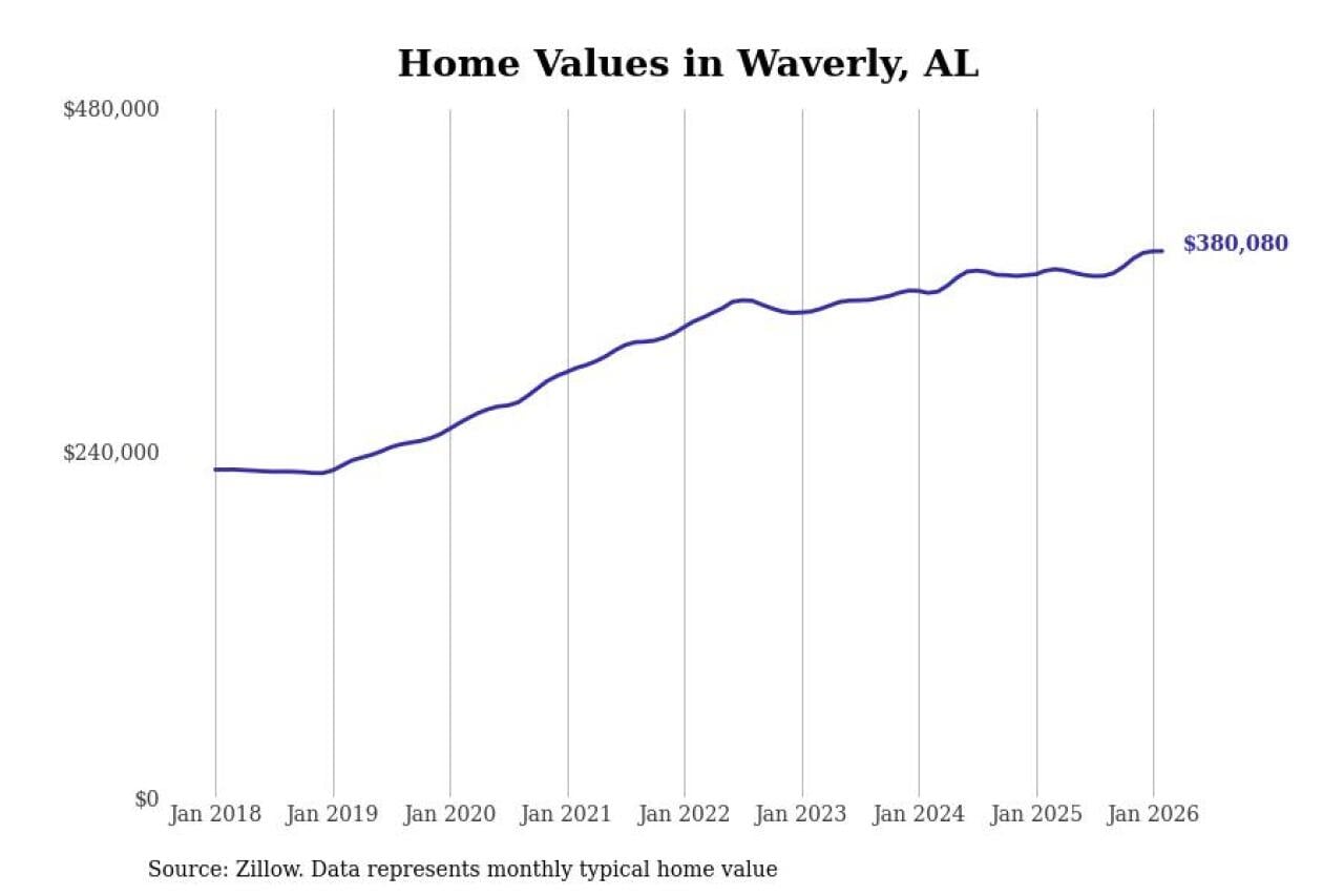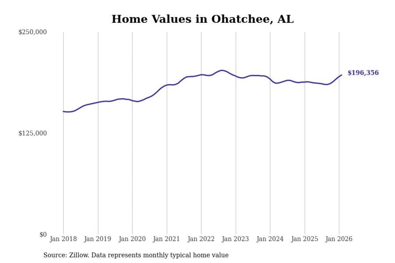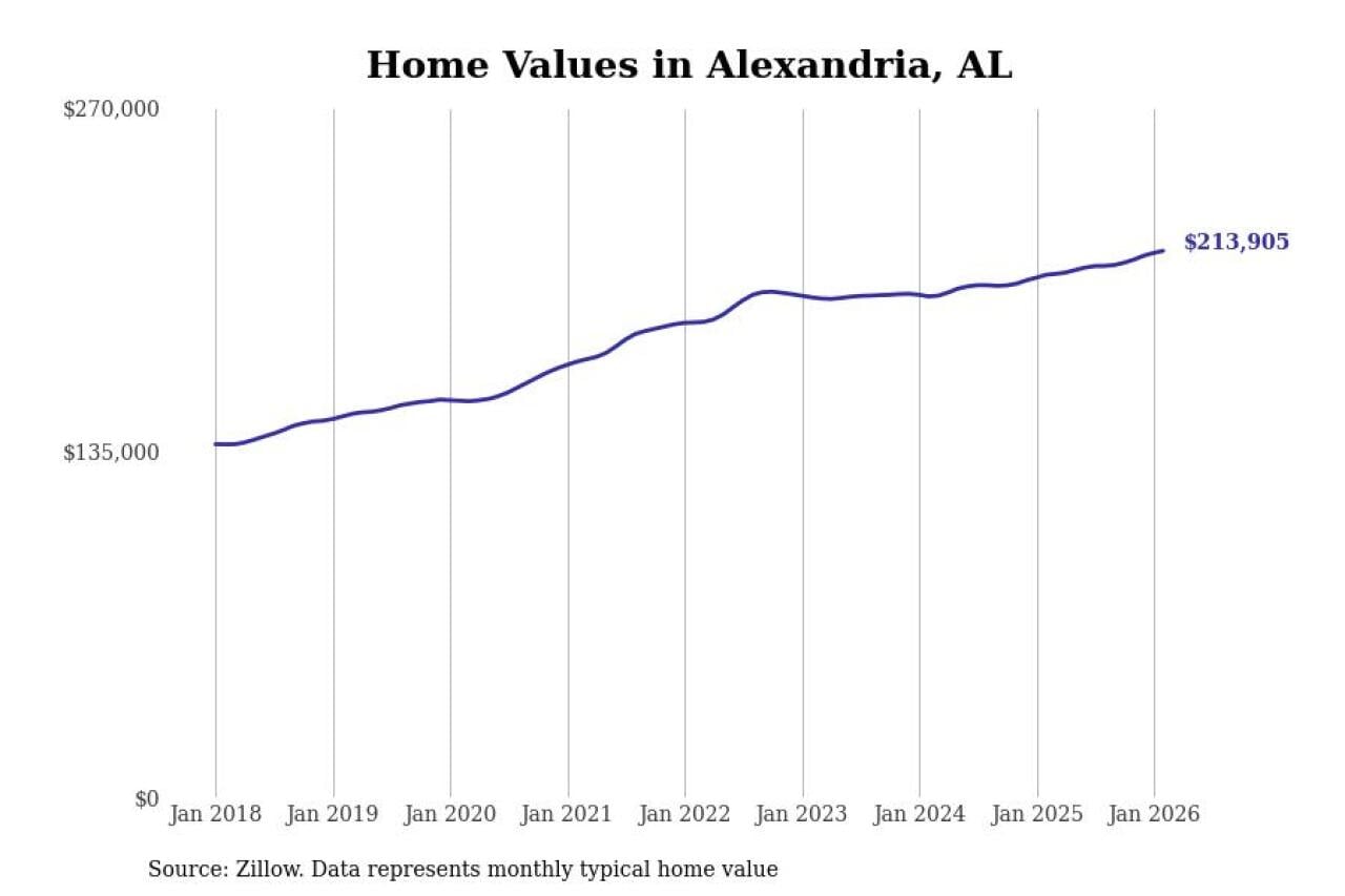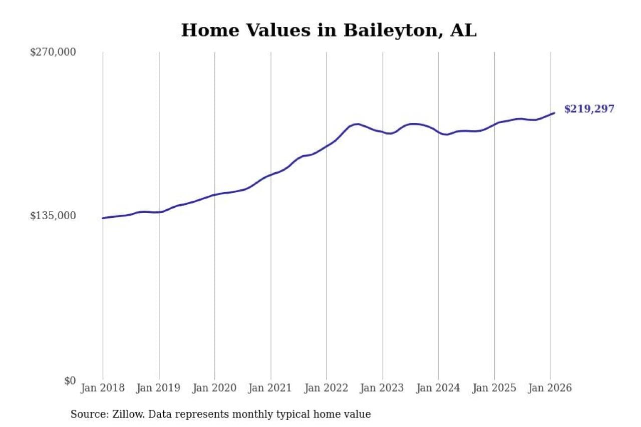 Stacker compiled a list of cities with the fastest-growing home prices in Alabama using data from Zillow. Cities are ranked by the dollar change in the Zillow Home Values Index for all homes from the 12 months ending February 2026. The charts in this story were created automatically using Matplotlib. Data was available for 50 cities and towns in Alabama.