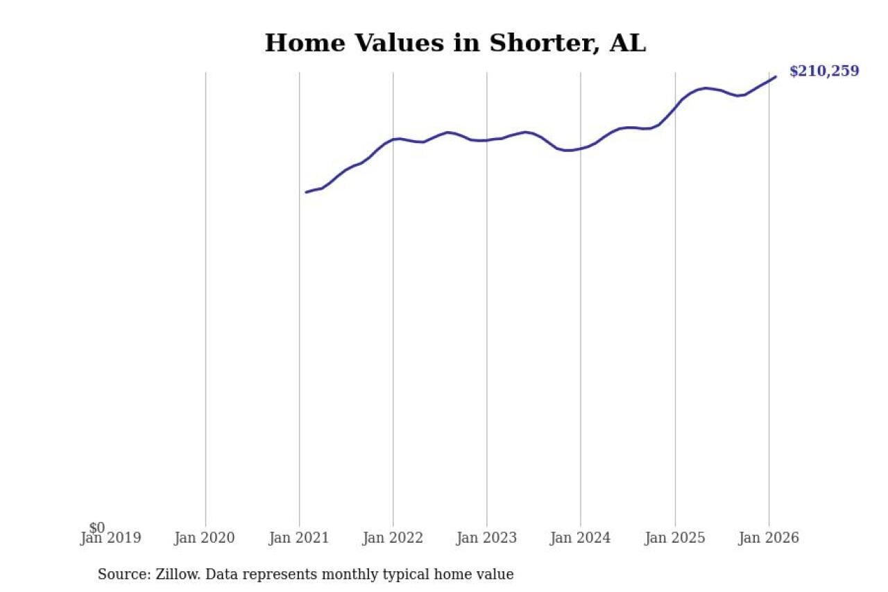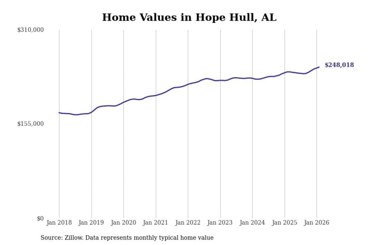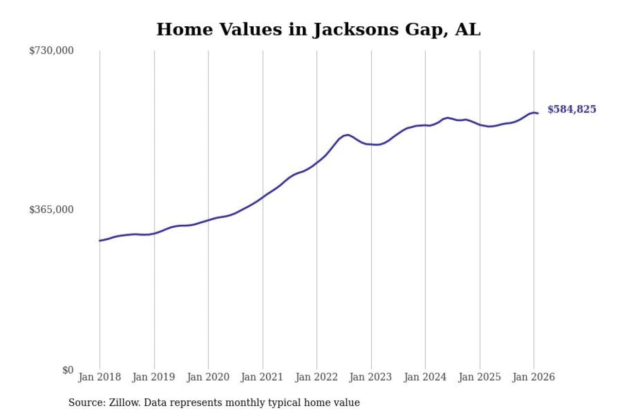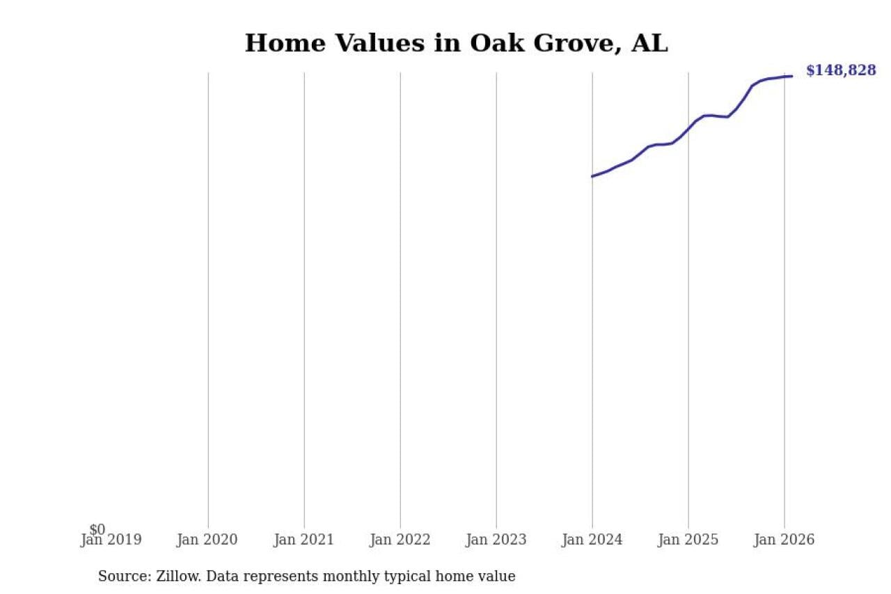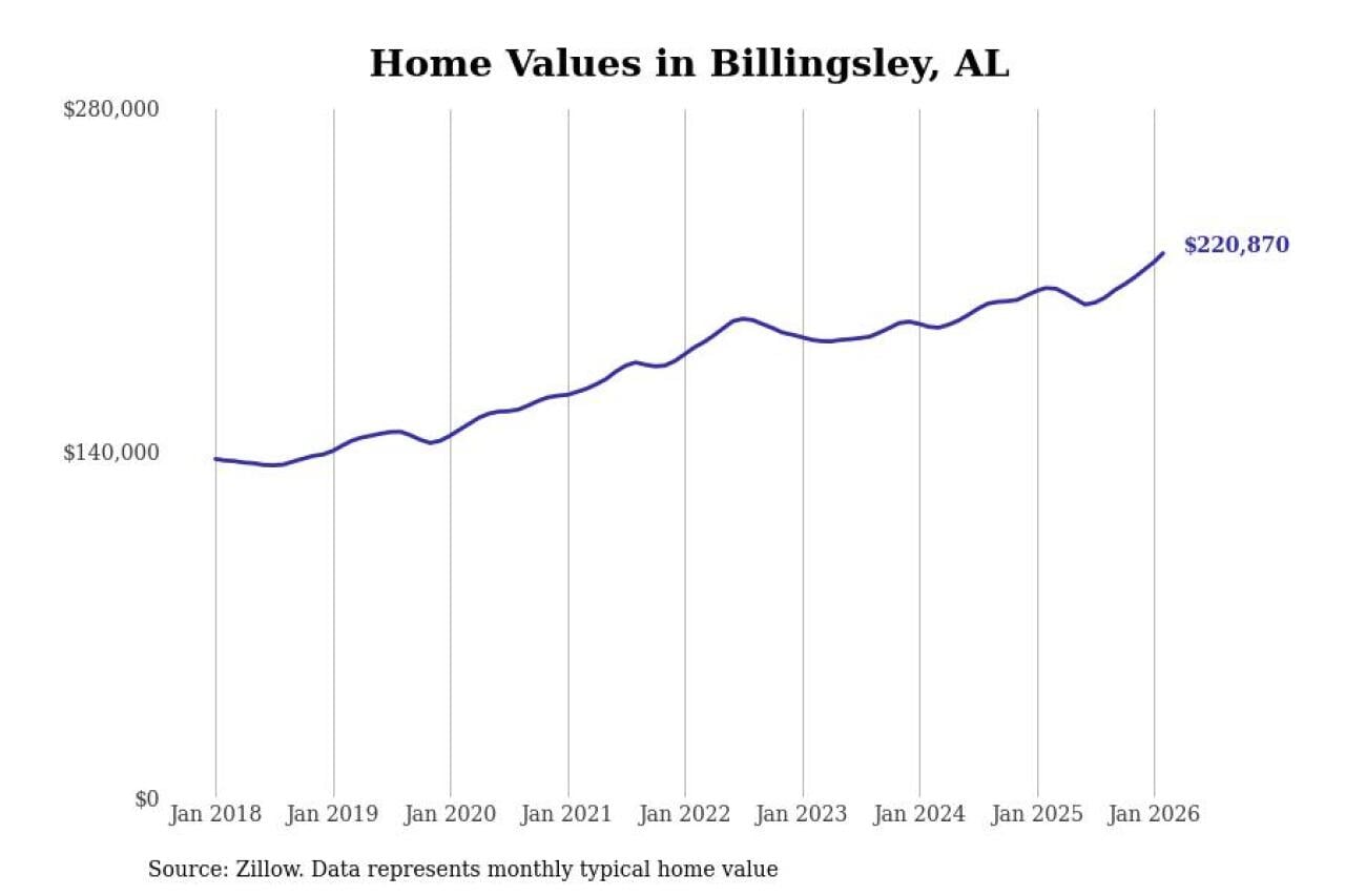 Stacker compiled a list of cities with the fastest-growing home prices in Alabama using data from Zillow. Cities are ranked by the dollar change in the Zillow Home Values Index for all homes from the 12 months ending February 2026. The charts in this story were created automatically using Matplotlib. Data was available for 50 cities and towns in Alabama.