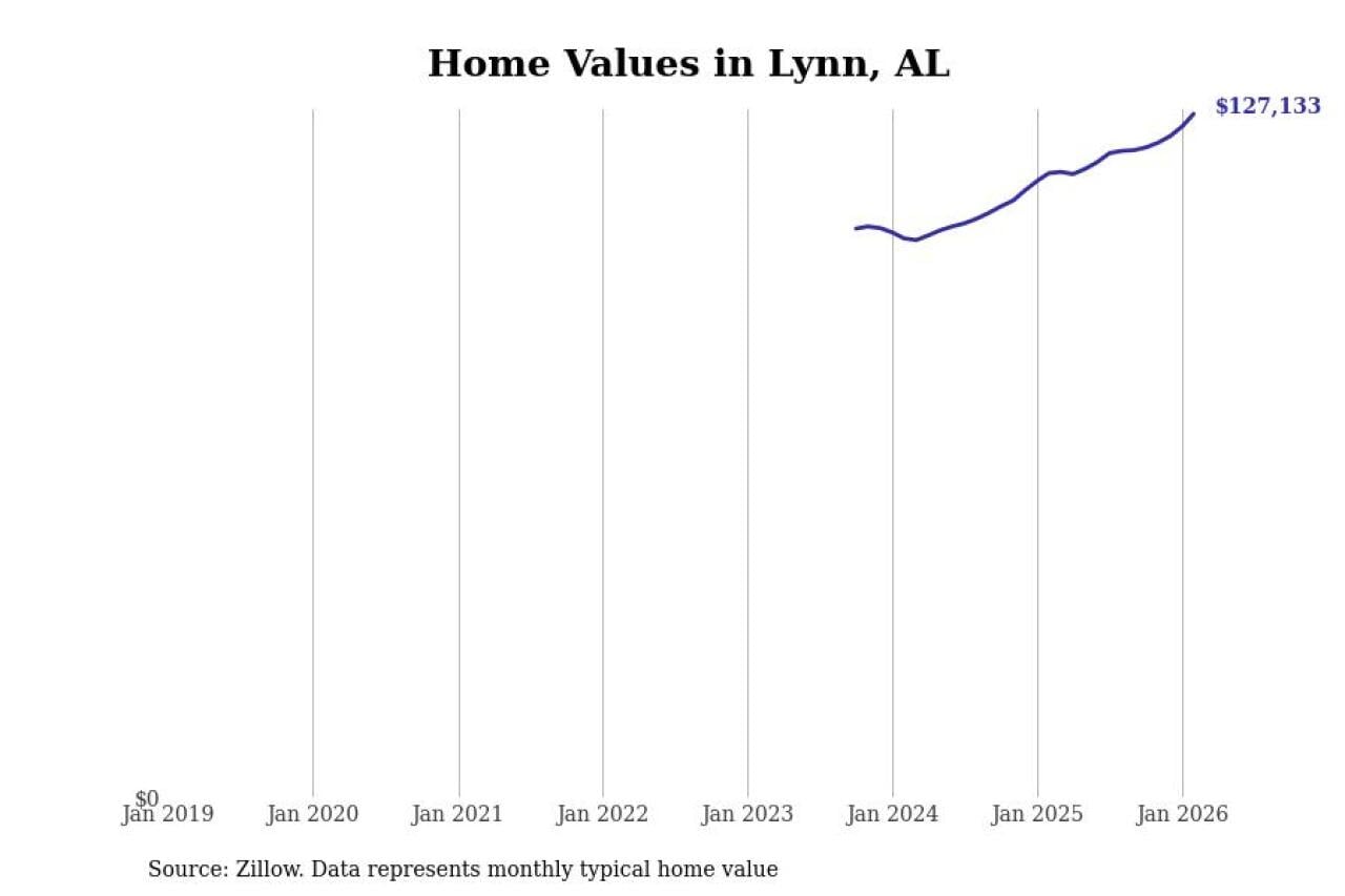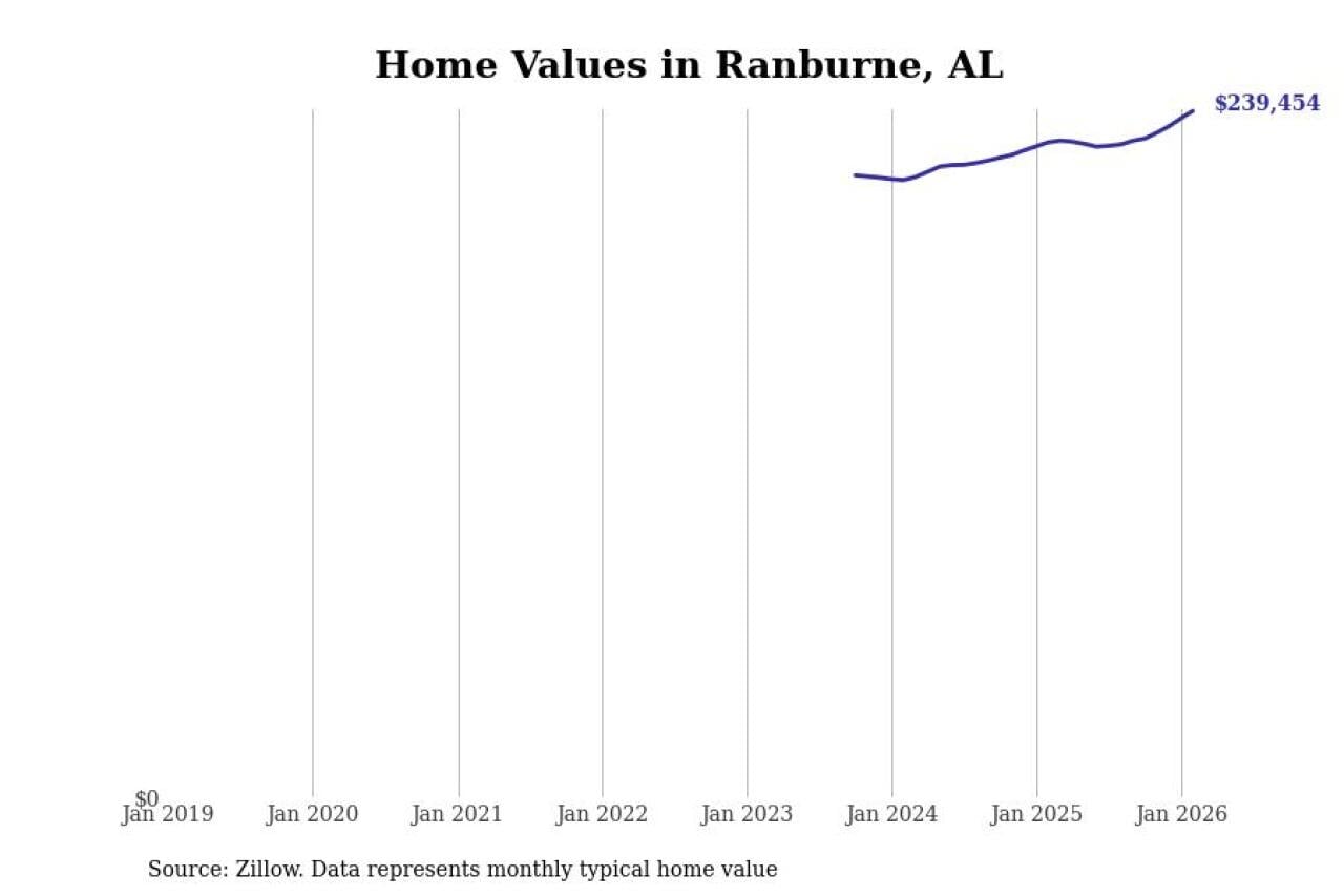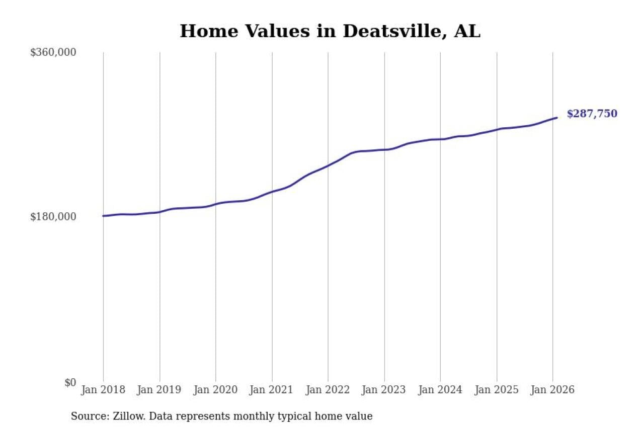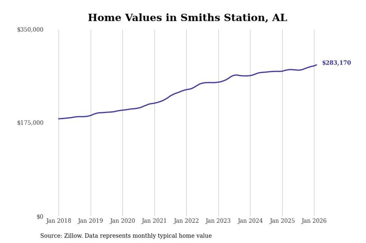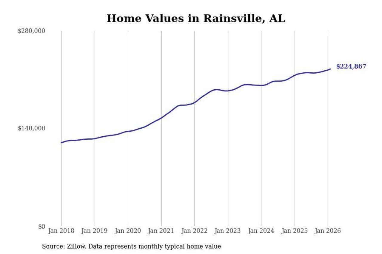 Stacker compiled a list of cities with the fastest-growing home prices in Alabama using data from Zillow. Cities are ranked by the dollar change in the Zillow Home Values Index for all homes from the 12 months ending February 2026. The charts in this story were created automatically using Matplotlib. Data was available for 50 cities and towns in Alabama.