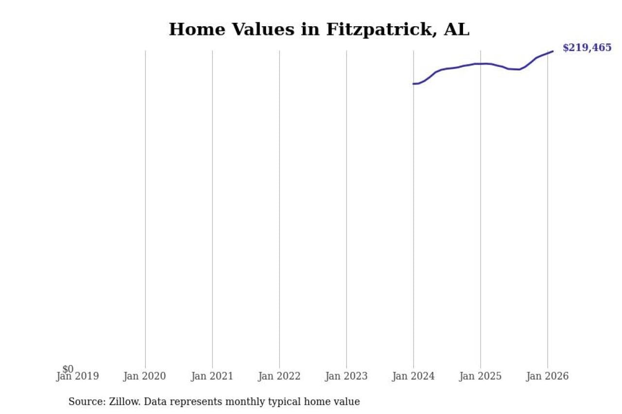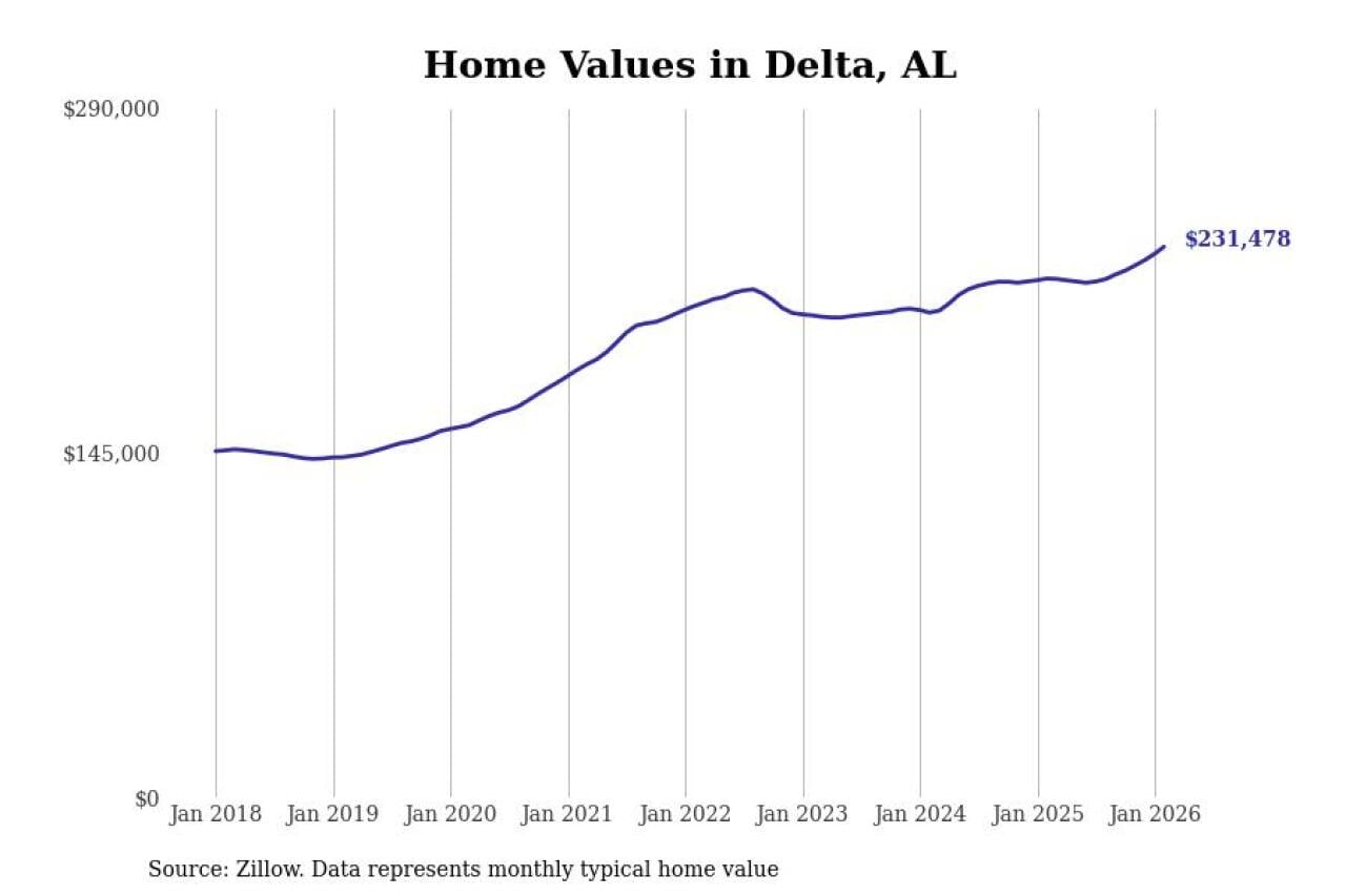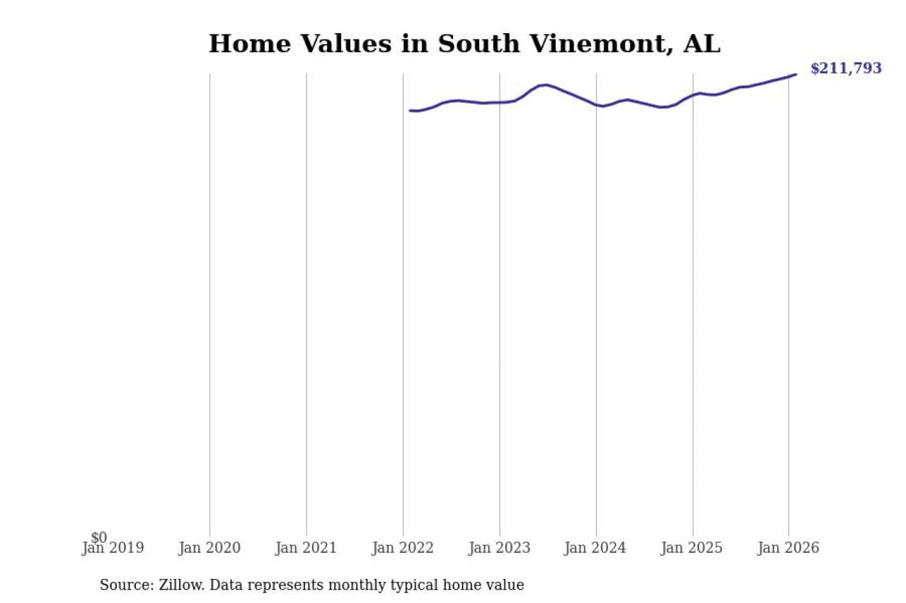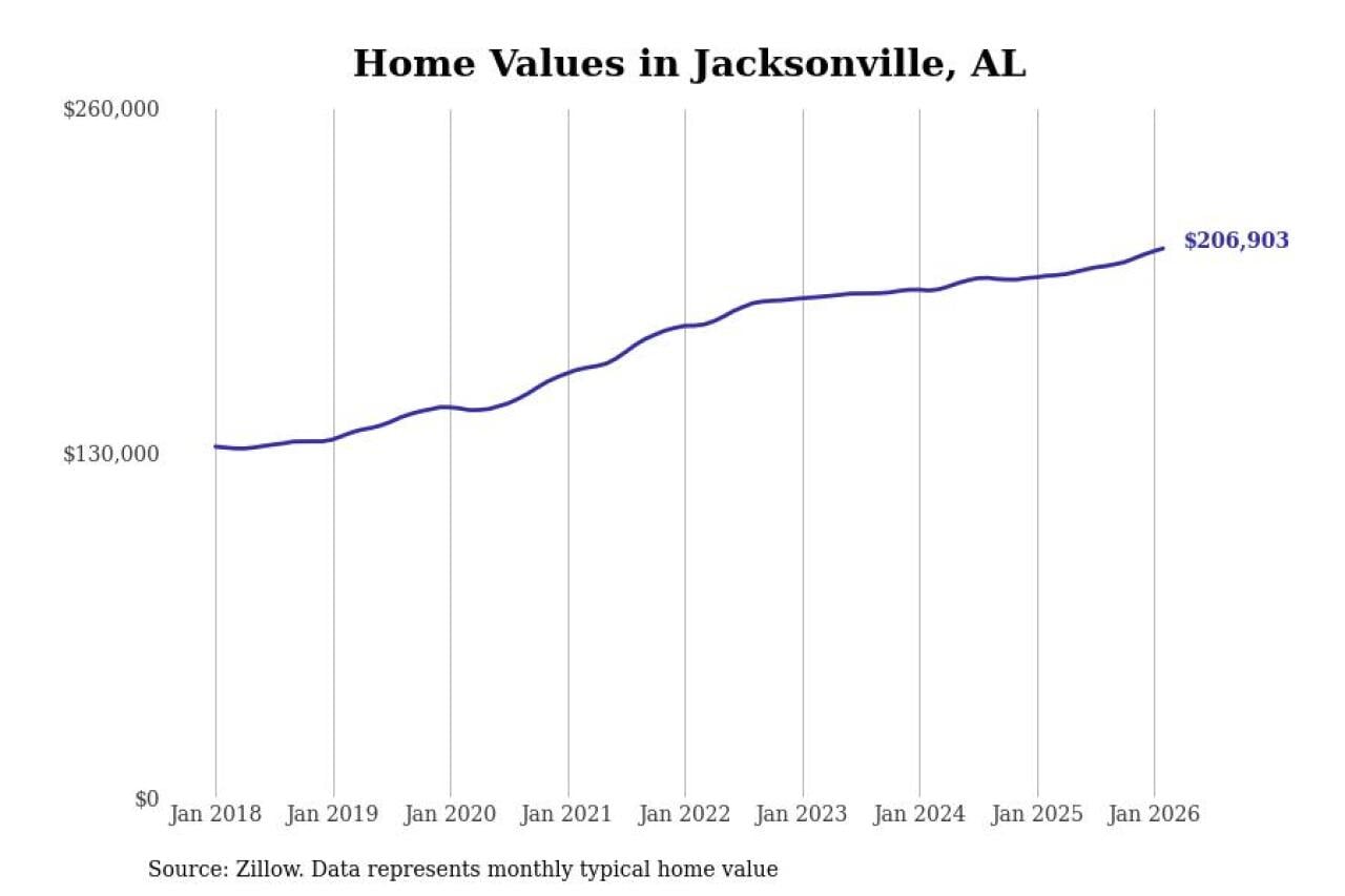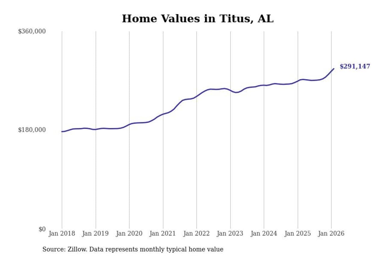 Stacker compiled a list of cities with the fastest-growing home prices in Alabama using data from Zillow. Cities are ranked by the dollar change in the Zillow Home Values Index for all homes from the 12 months ending February 2026. The charts in this story were created automatically using Matplotlib. Data was available for 50 cities and towns in Alabama.