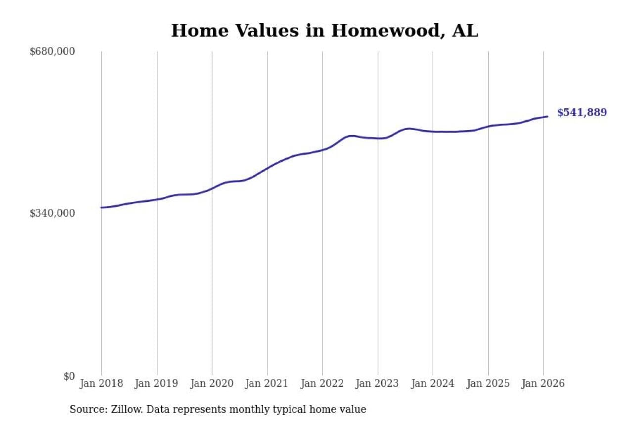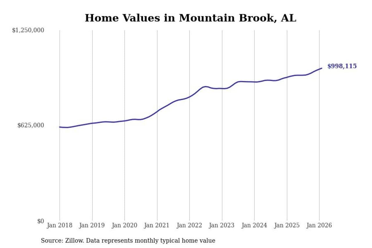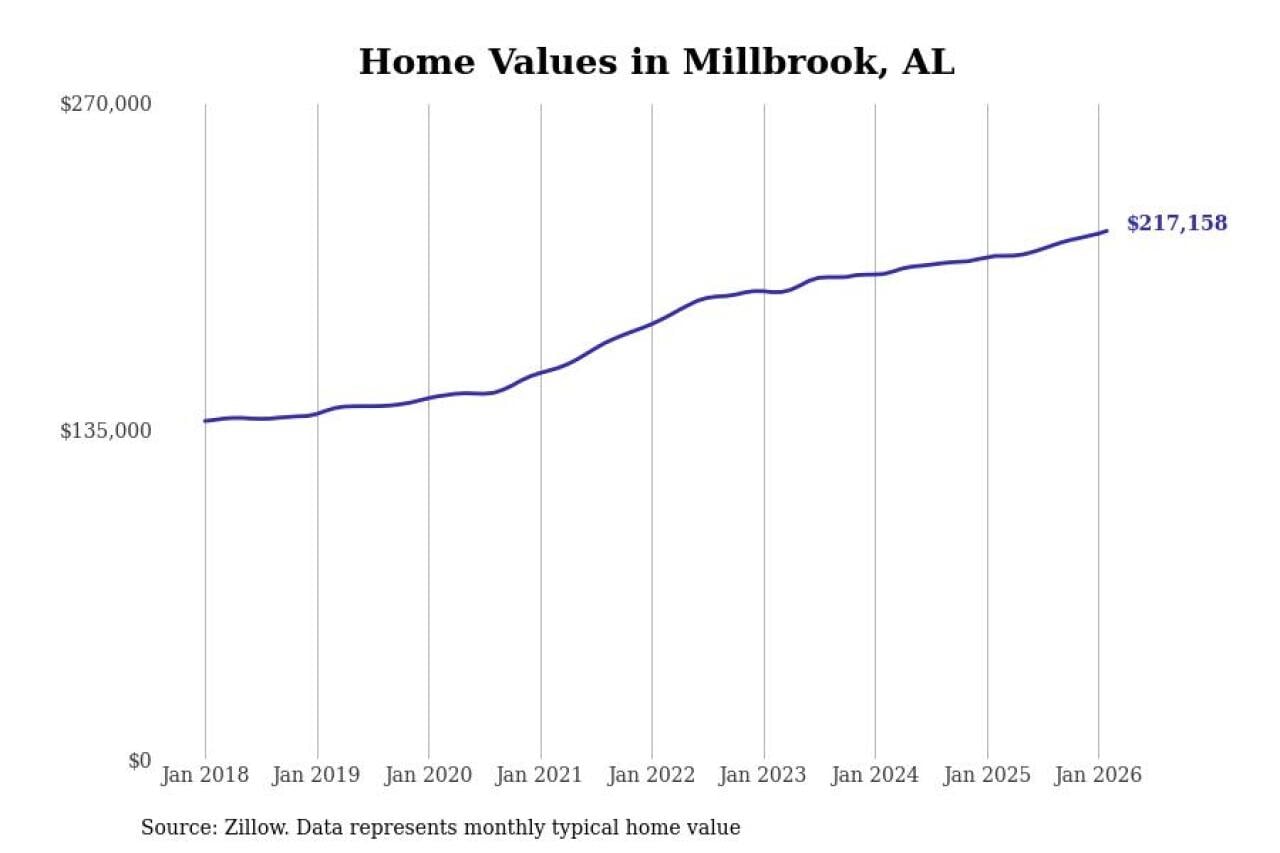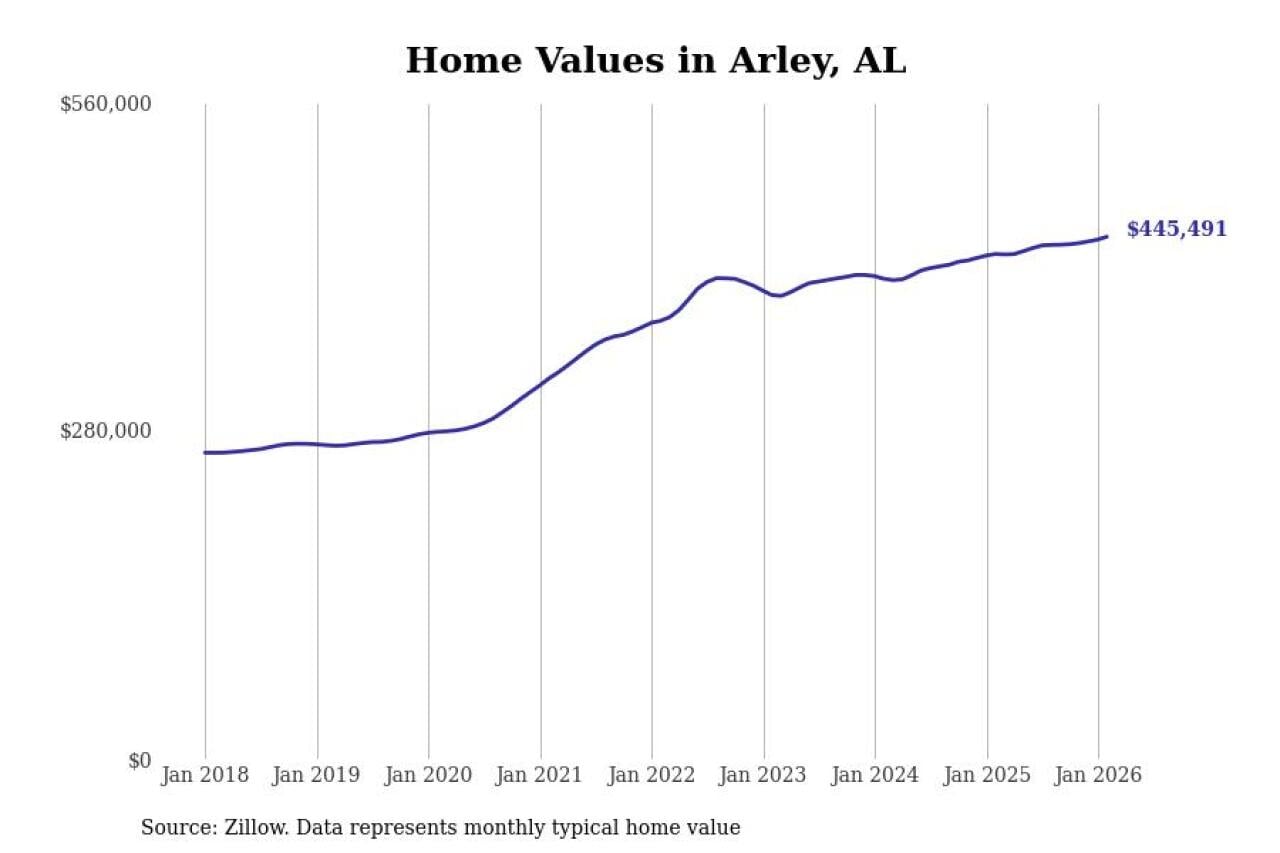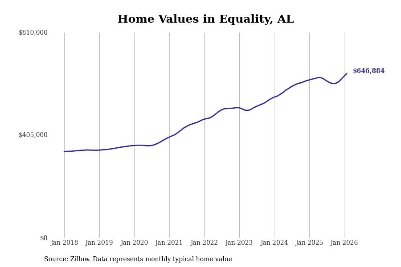 Stacker compiled a list of cities with the fastest-growing home prices in Alabama using data from Zillow. Cities are ranked by the dollar change in the Zillow Home Values Index for all homes from the 12 months ending February 2026. The charts in this story were created automatically using Matplotlib. Data was available for 50 cities and towns in Alabama.