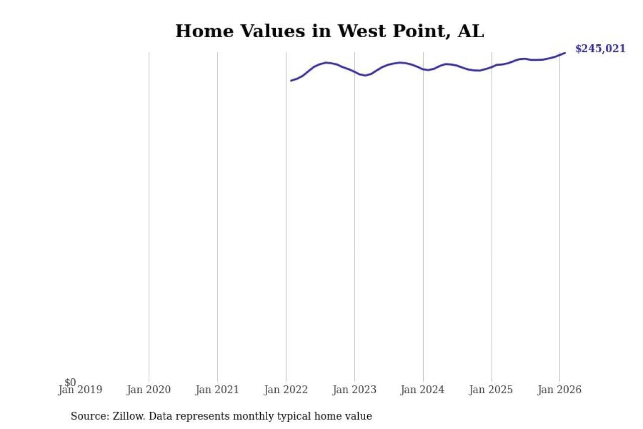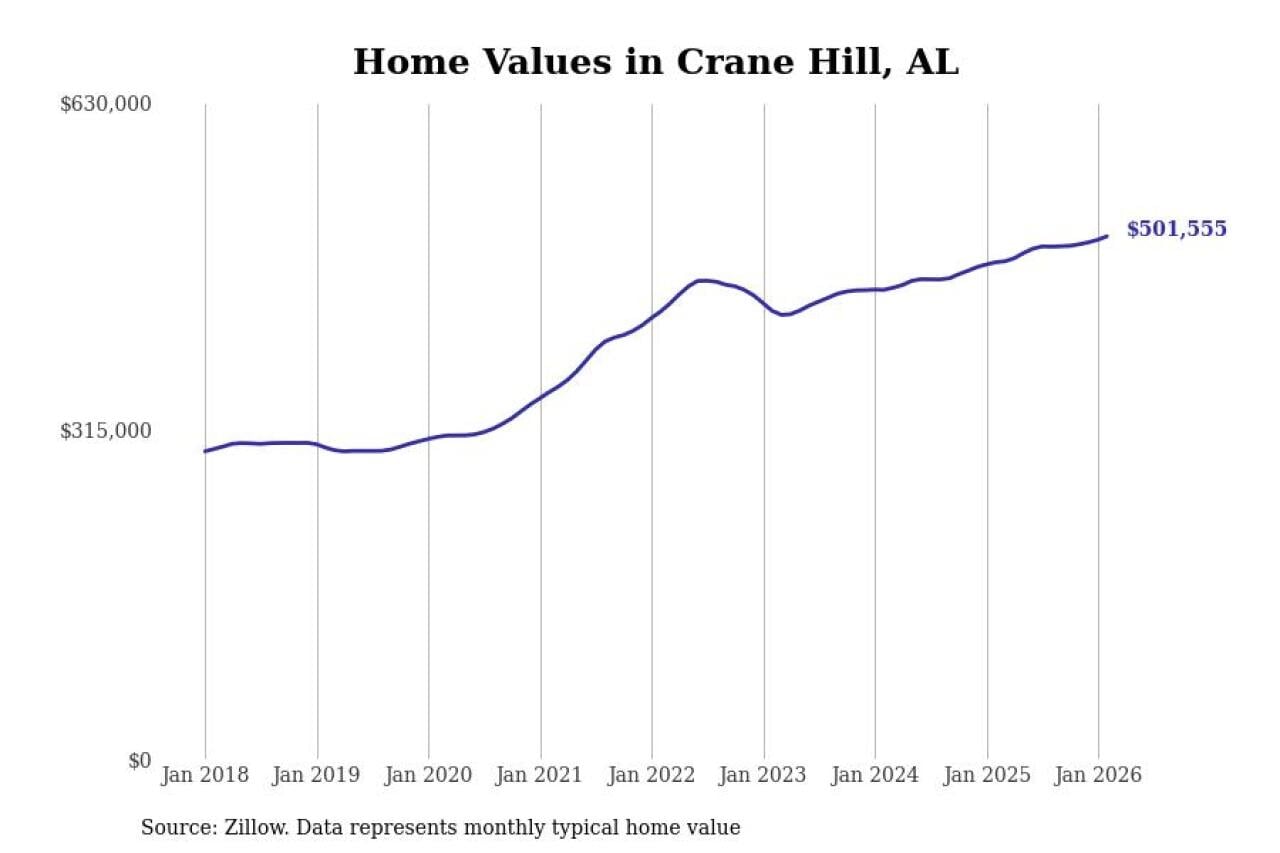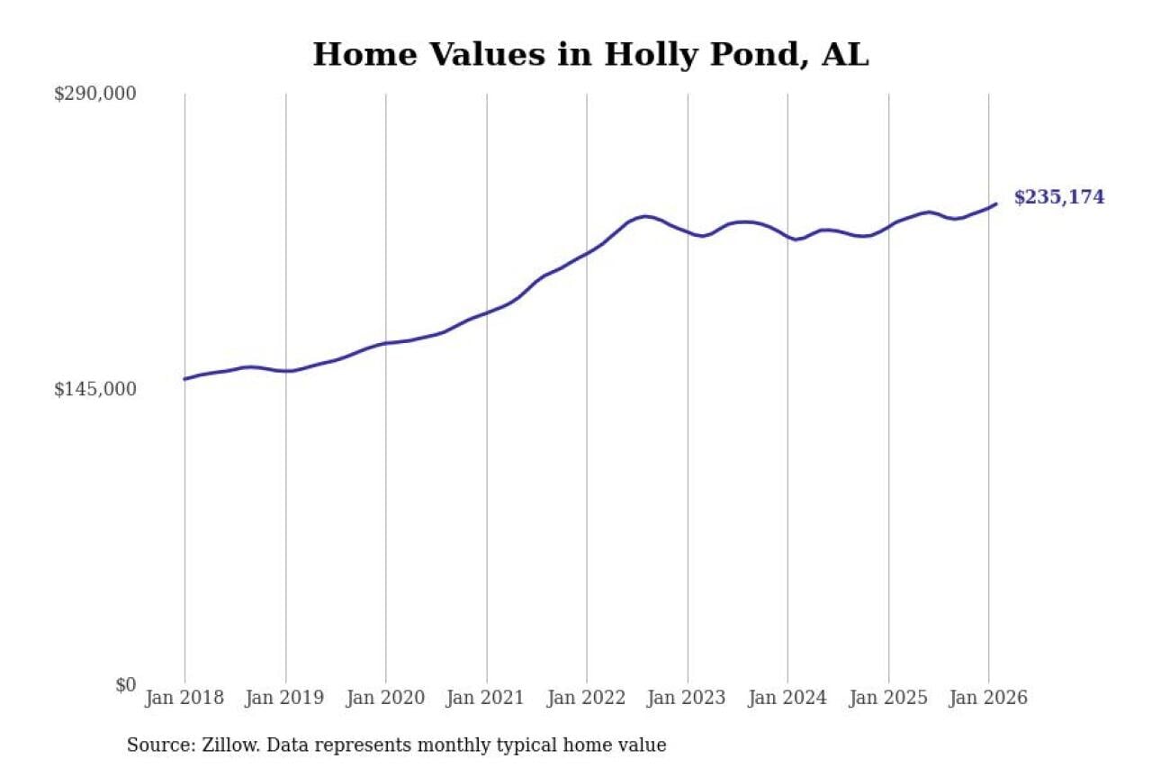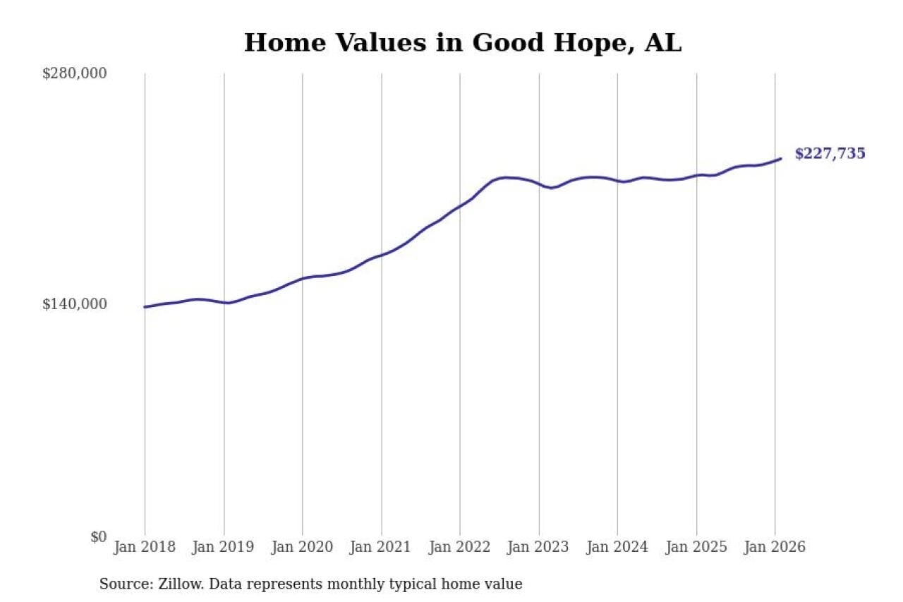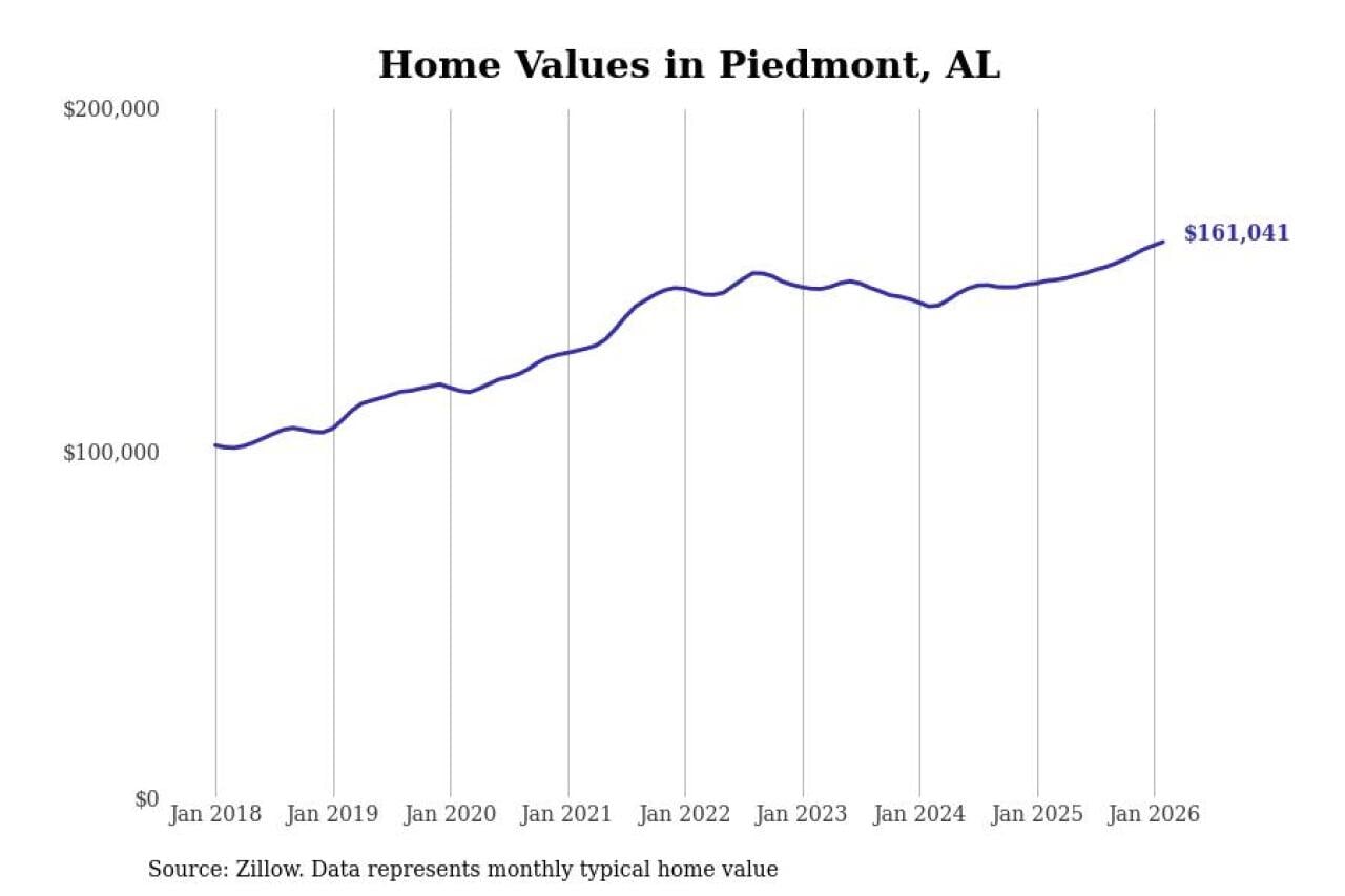 Stacker compiled a list of cities with the fastest-growing home prices in Alabama using data from Zillow. Cities are ranked by the dollar change in the Zillow Home Values Index for all homes from the 12 months ending February 2026. The charts in this story were created automatically using Matplotlib. Data was available for 50 cities and towns in Alabama.