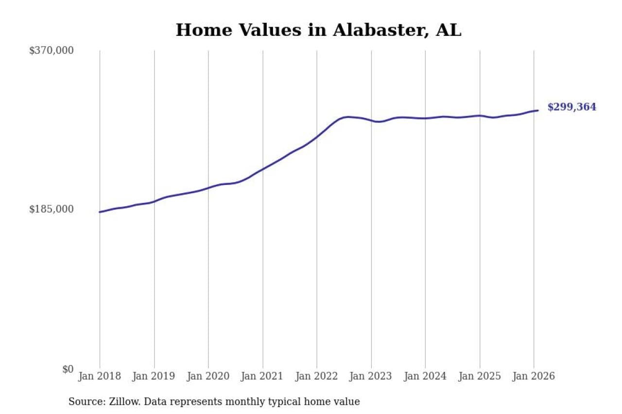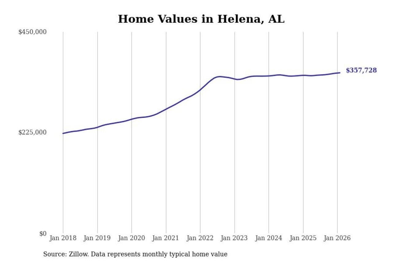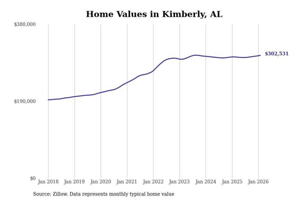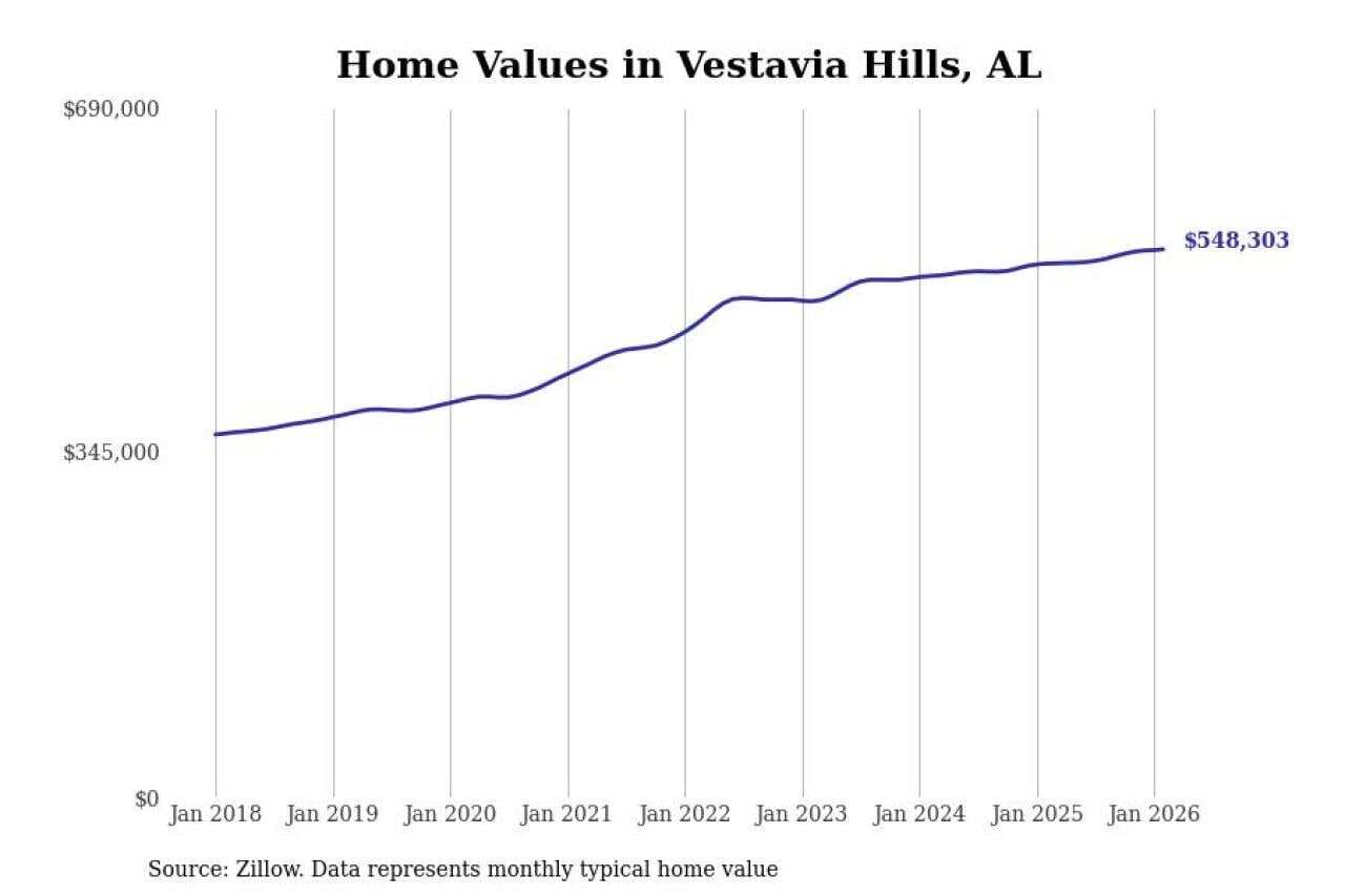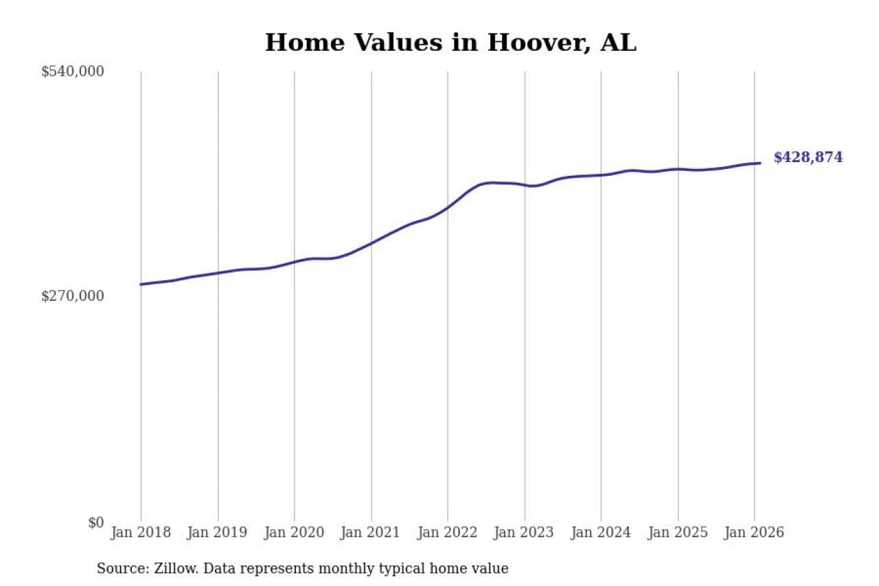 Stacker compiled a list of cities with the most expensive homes in the Birmingham-Hoover, AL metro area using data from Zillow. Charts show the monthly typical home value since January 2018.