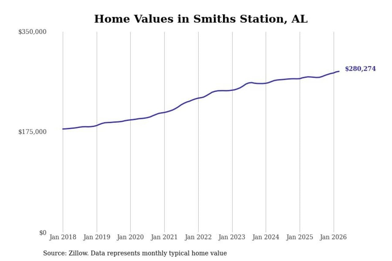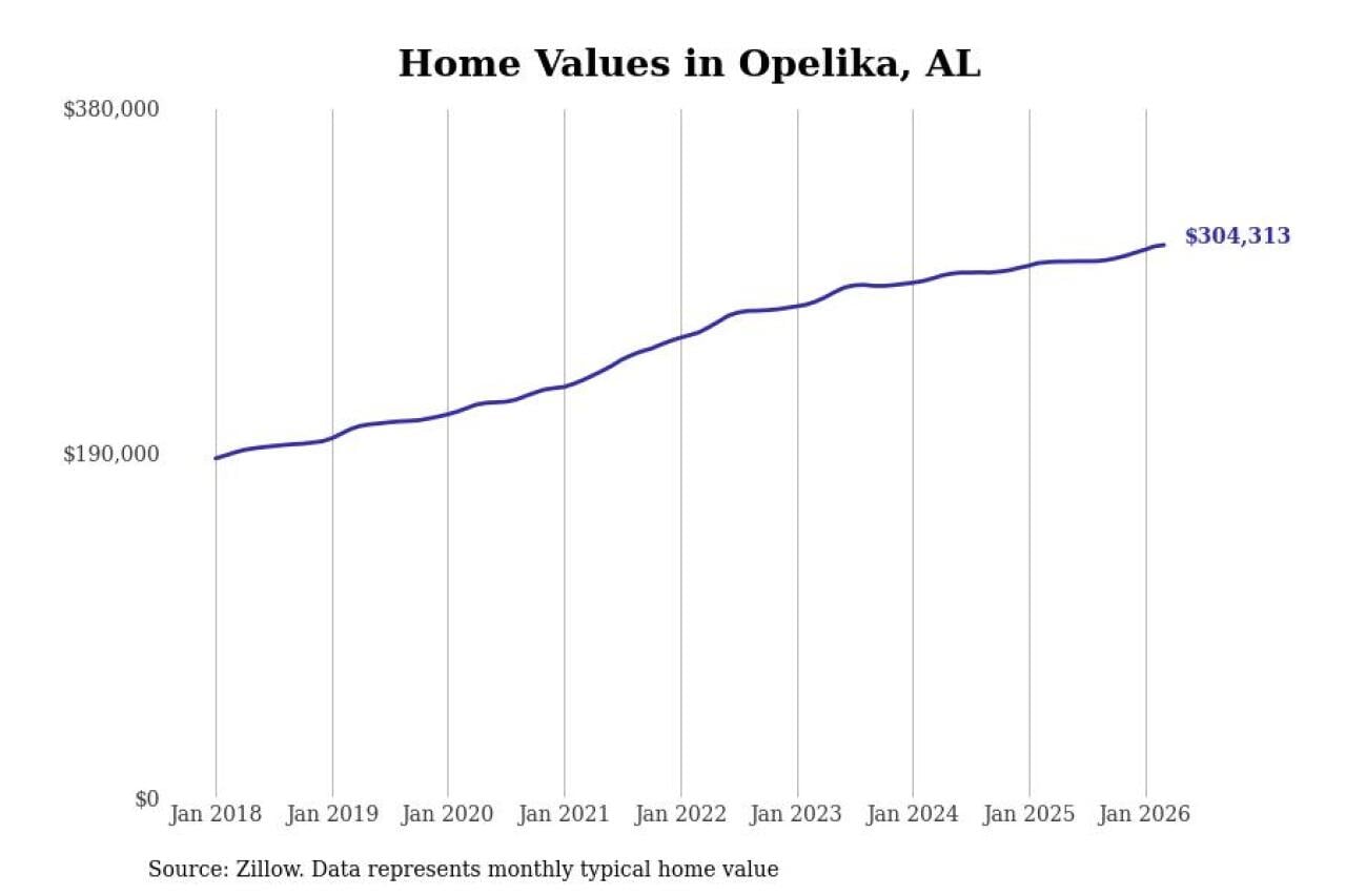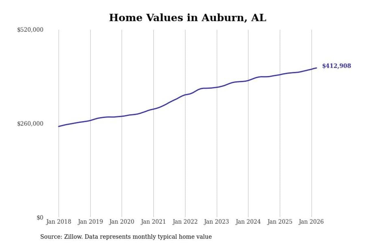 Stacker compiled a list of cities with the most expensive homes in the Auburn-Opelika, AL metro area using data from Zillow. Charts show the monthly typical home value since January 2018.